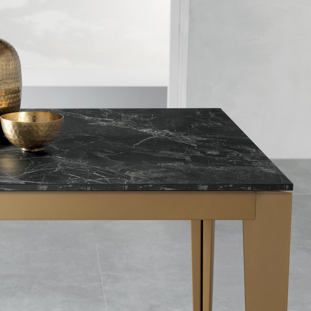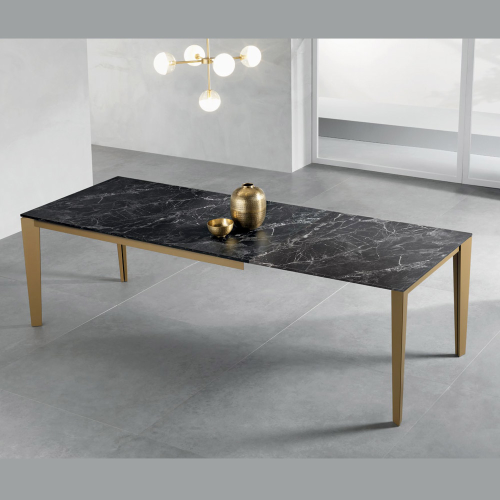 Elegantă și funcțională, această masă dreptunghiulară extensibilă combină designul modern cu caracterul practic. Blatul laminat cu efect de marmură închisă, cu grosimea de 18 mm, evidențiază textura caldă și autentică a marmurei, în timp ce picioarele din metal vopsit în auriu învechit adaugă stabilitate și o notă contemporană.