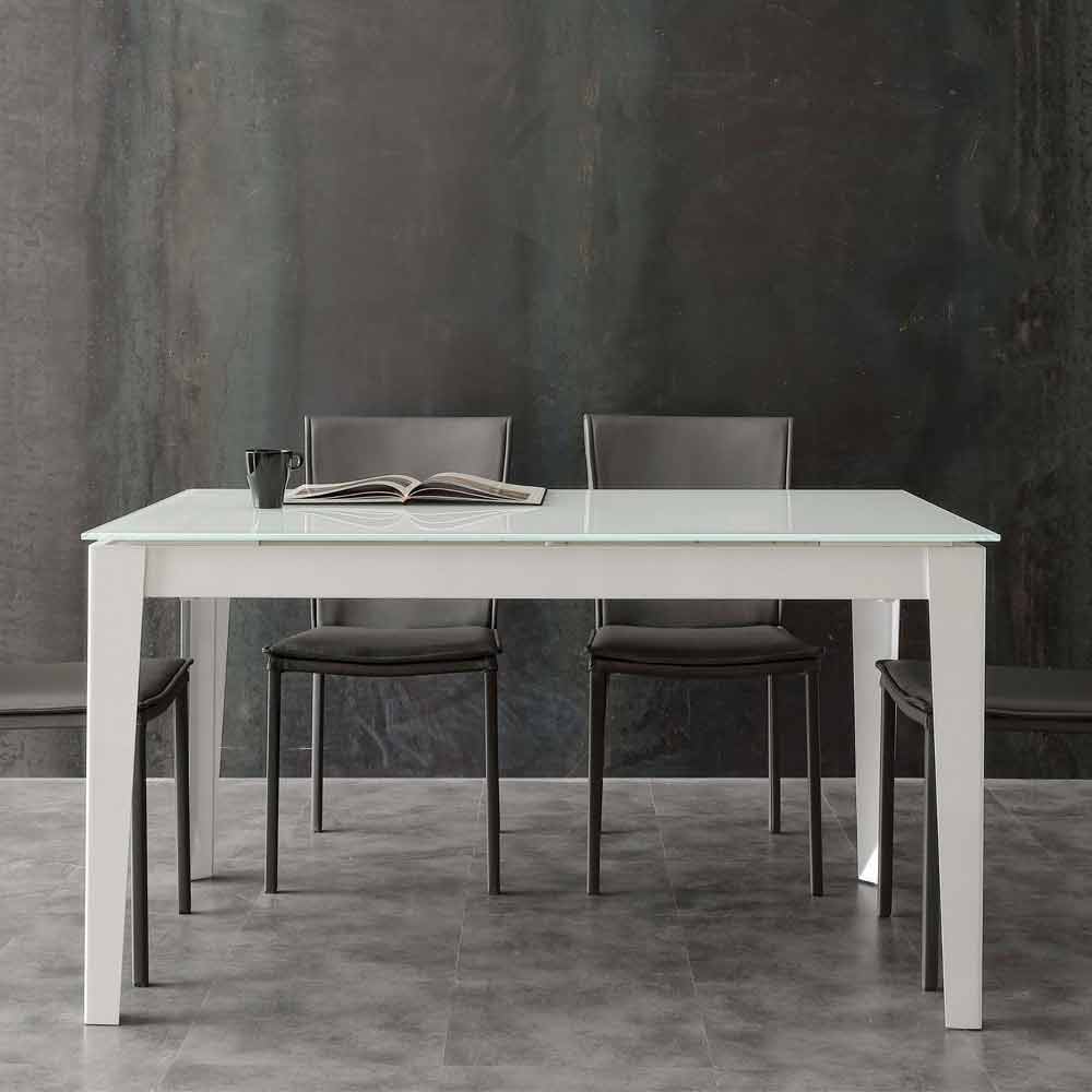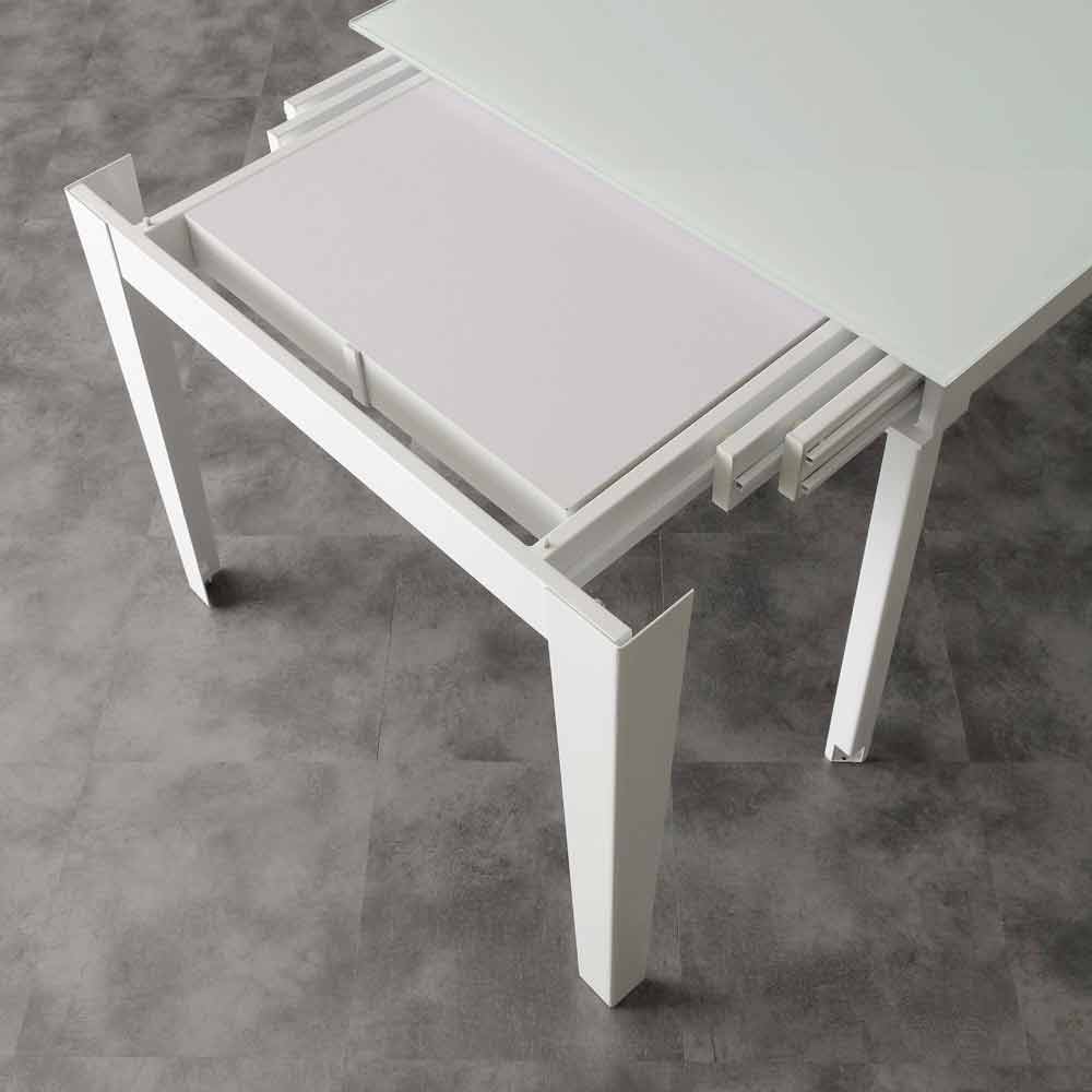 Această masă este alcătuită dintr-o sticlă călită (10 mm), disponibilă în două finisaje diferite: Tortora lucioasă transparentă cu structură metalică în aceeași culoare sau în versiune Extrawhite lustruită cu structură metalică în finisaj alb.