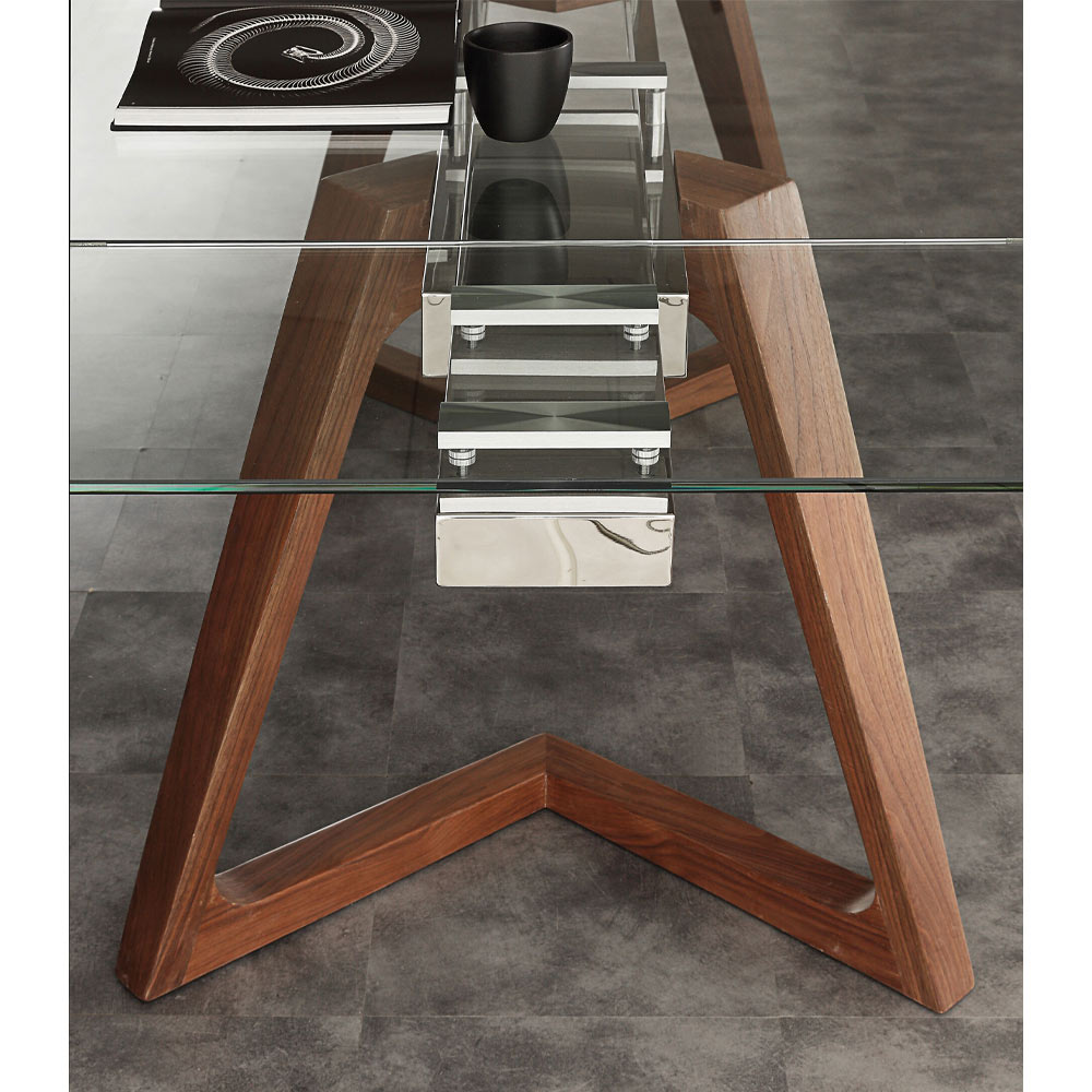 Bazele sale din lemn masiv, cu o formă geometrică și învăluitoare, adaugă o notă de căldură naturală și modernitate mediului, făcându-l perfect pentru orice interior, de la clasic la contemporan. Designul sofisticat al mesei nu numai că amplifică percepția spațiului cu ușurința sa vizuală, dar garantează și stabilitate și rezistență pe care doar materialele de înaltă calitate le pot oferi.