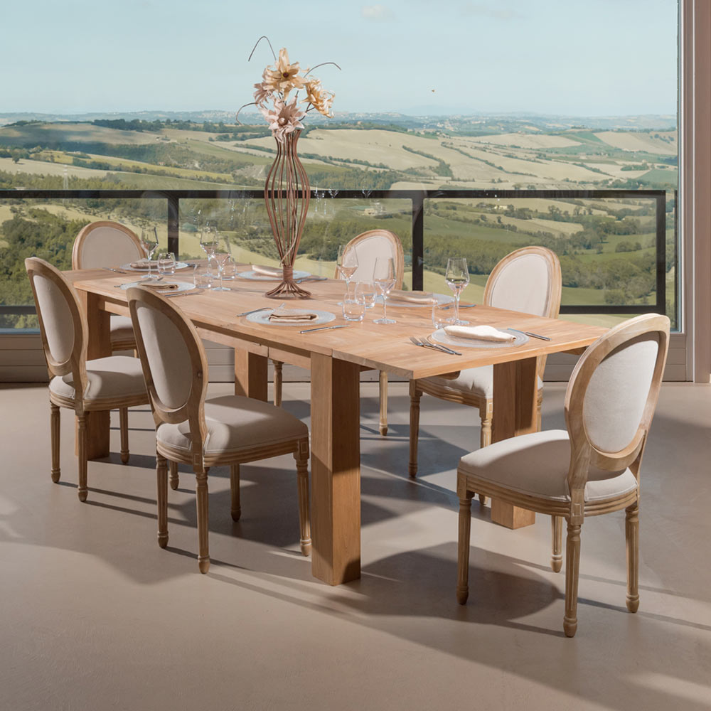 Această masă extensibilă din lemn masiv de tec este o soluție practică și elegantă de mobilier, ideală pentru sufragerie sau bucătărie. Structura robustă și măiestria execuției evidențiază textura naturală a lemnului , conferind căldură și caracter spațiului.