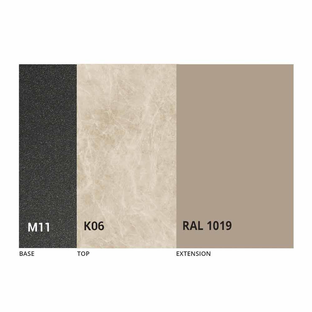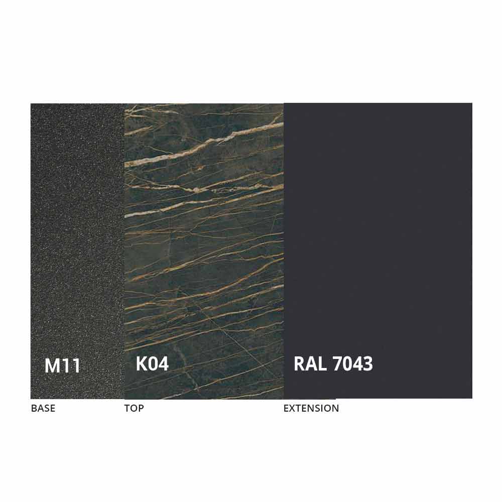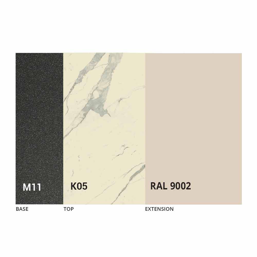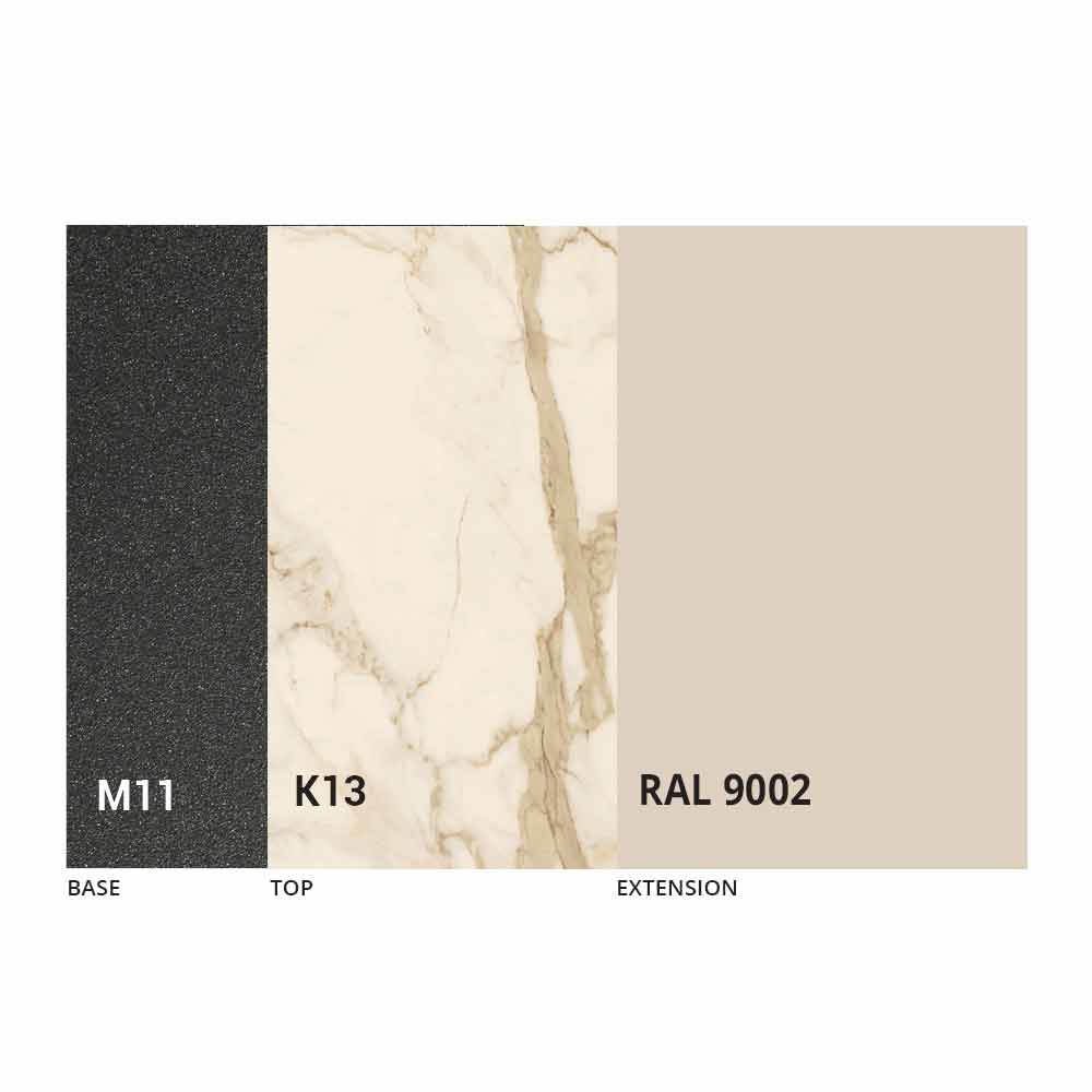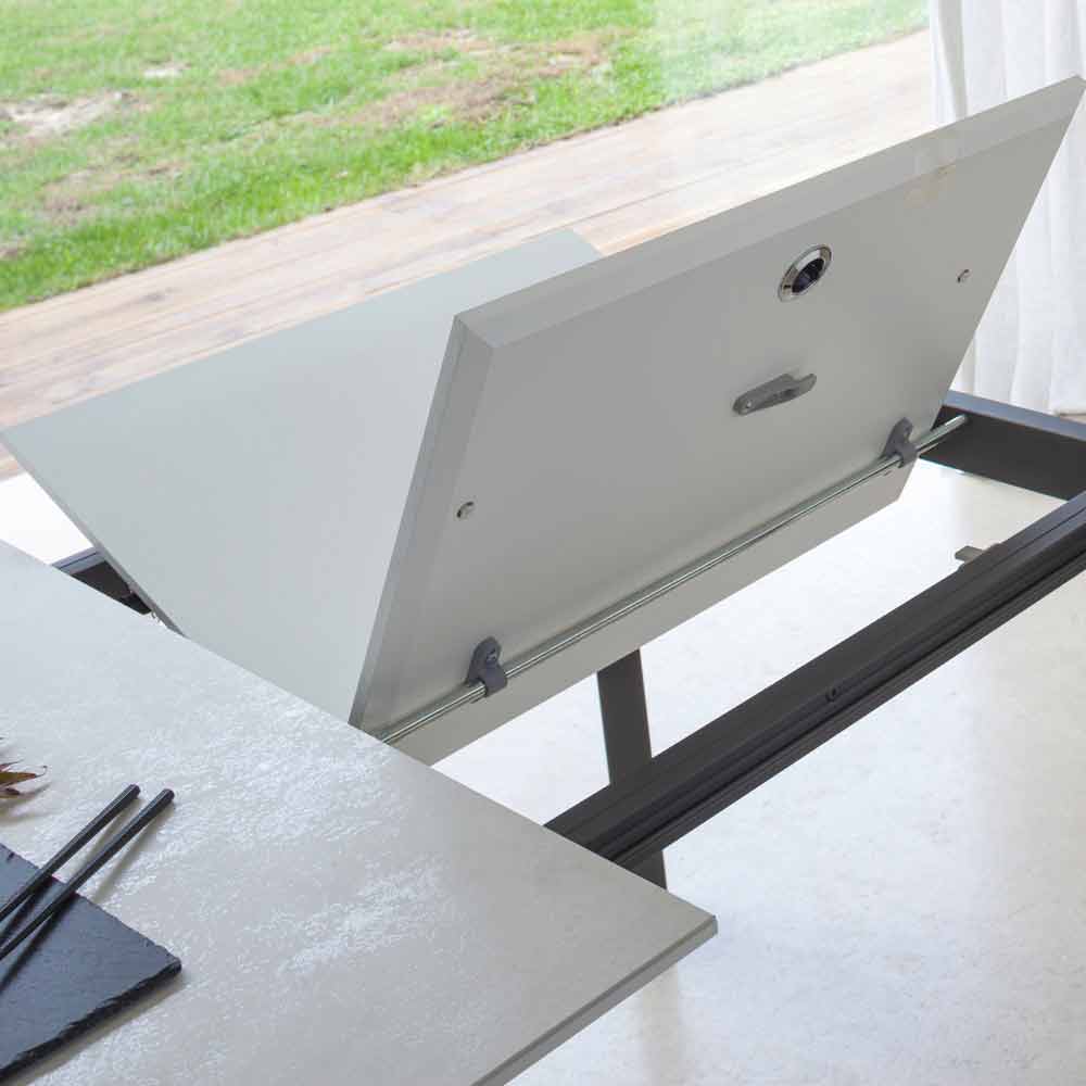 NB: la deschiderea mesei este necesar să ridicați extensia, să o poziționați la nivelul blatului și, abia apoi, să o deschideți. Blatul și baza mesei pot fi personalizate cu diferite materiale și finisaje mostre sau lacuire RAL. Pentru informații, contactați-ne folosind formularul corespunzător „ Solicitați informații” .