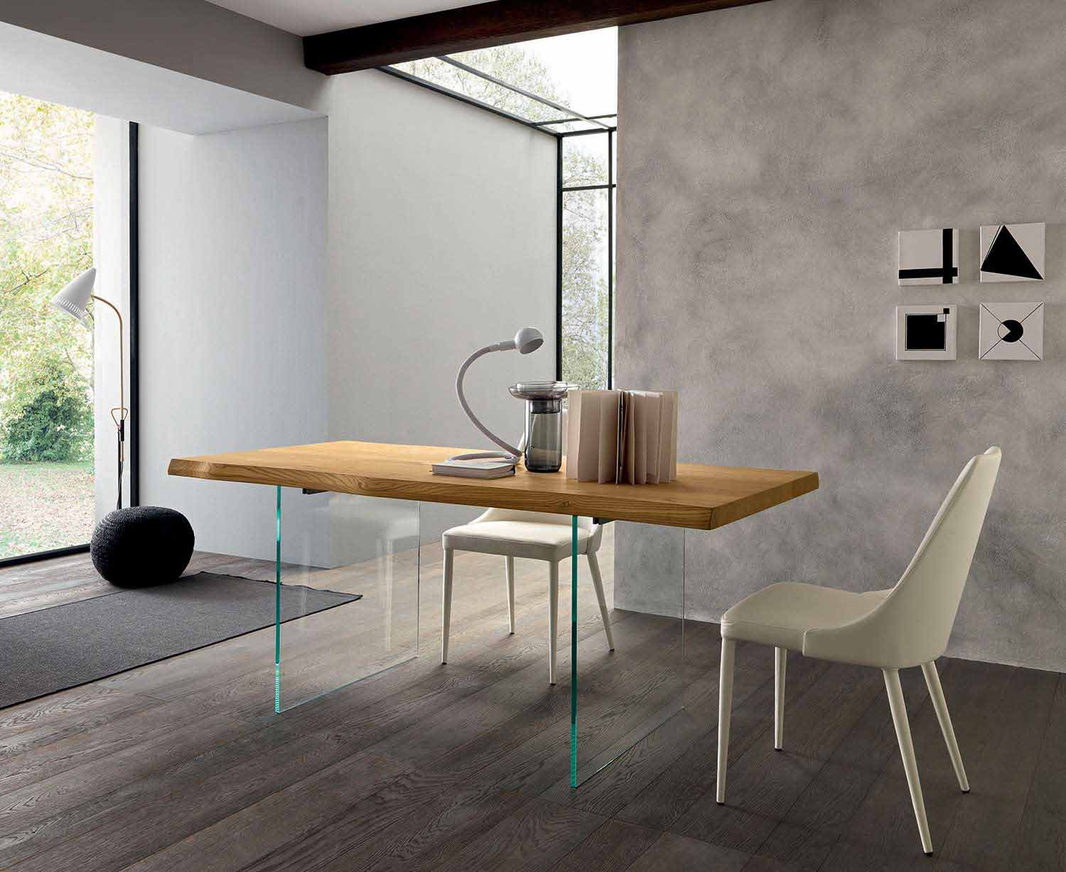 picioarele din sticlă transparentă , care par să facă blatul din lemn să plutească cu o referință naturală puternică și