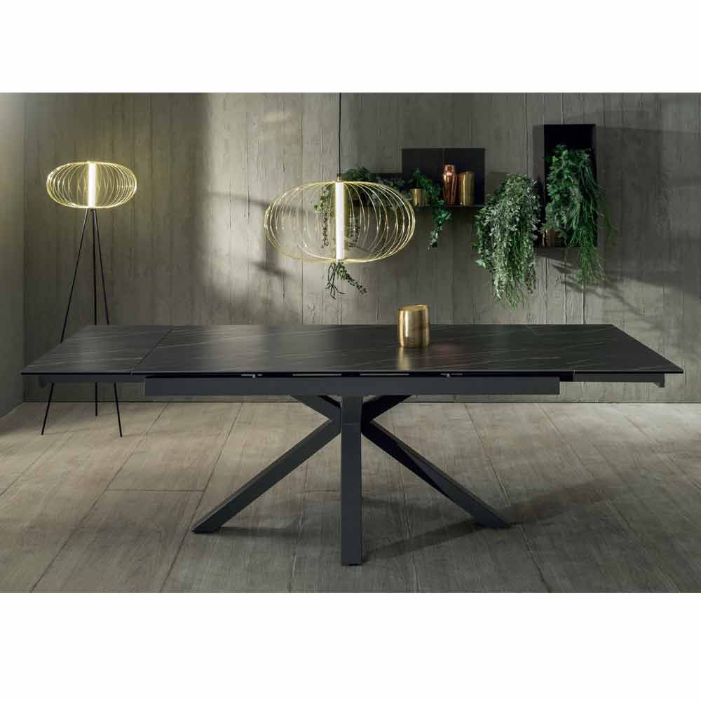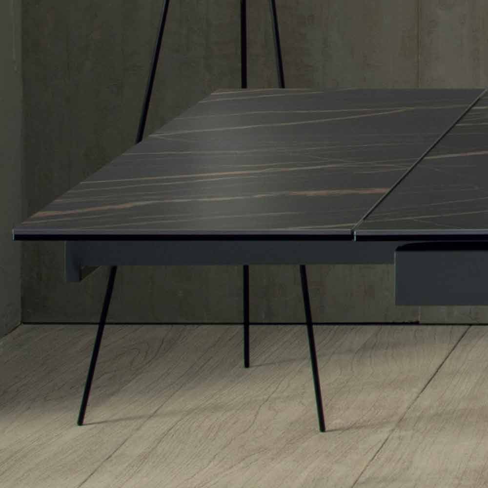 Masă extensibilă de design, cu blat din ceramică și bază din metal.