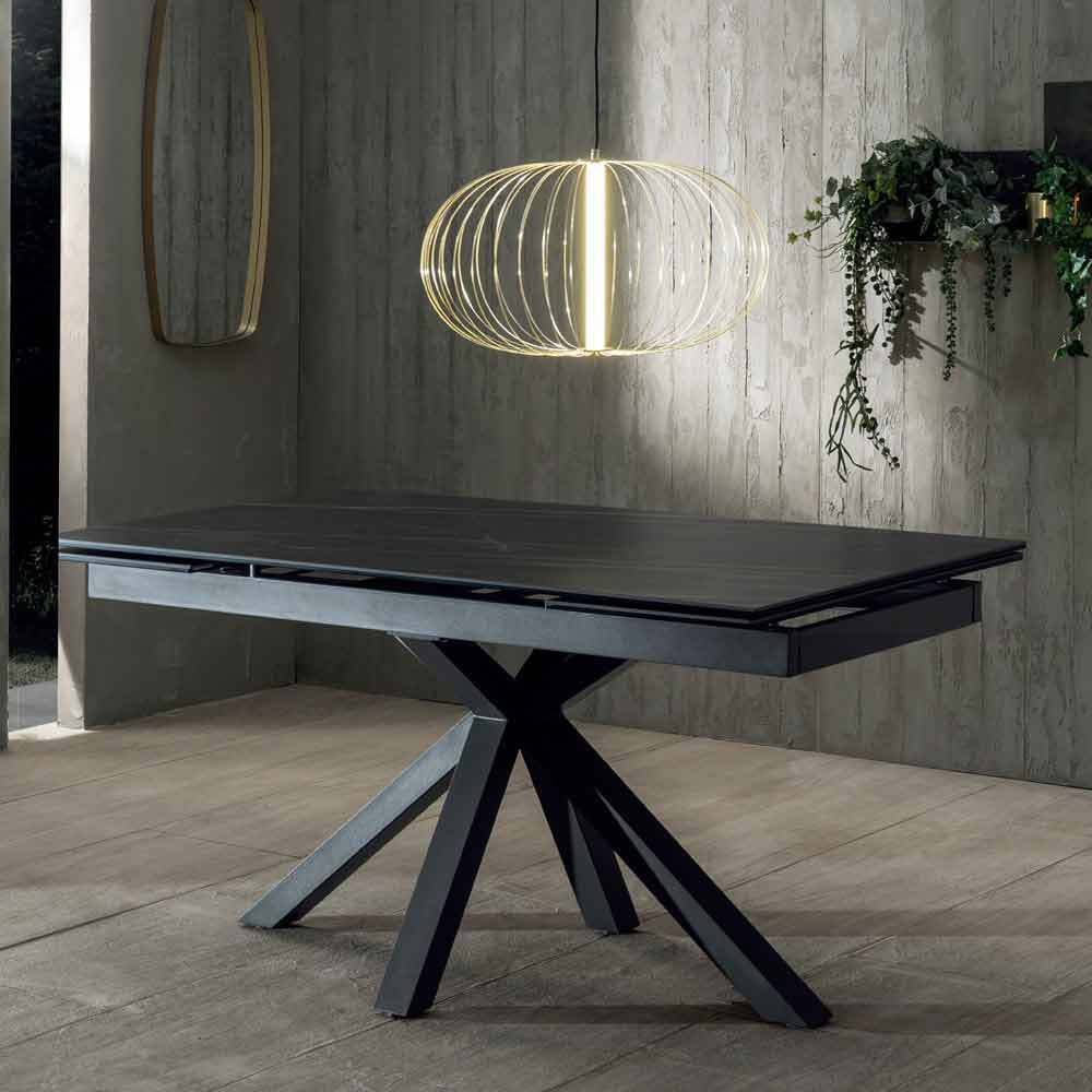 Această masă este caracterizată printr-un design elegant și un impact vizual puternic care îi permite să cucerească centrul atenției din cameră. Blatul este realizat din ceramică cu efect portoro de 6 mm grosime sub care este așezat un strat de sticlă gros de 8 mm pentru a oferi flexibilitate ceramicii, evitând astfel deteriorarea în timp ce cadrul și picioarele sunt produse din metal mat vopsit antracit . Picioarele reprezintă unul dintre punctele fundamentale, deoarece oferă mișcare și un design unic minunat mesei și întregii încăperi în care este așezată. Ceea ce distinge această minunată masă de masă este, fără îndoială, posibilitatea de a extinde blatul până la o lungime de 240 cm datorită celor 2 extensii de 40 cm în același finisaj ca blatul și poziționate sub el. Datorită combinației de materiale și finisaje alese, acest articol este soluția perfectă pentru mobilarea medii caracterizate printr - un stil modern și rafinat , care necesită un tabel capabil de a da personalitate camerei prin combinarea frumusețe și eleganță , fără a neglija aspectul practic și funcțional fundamental . .