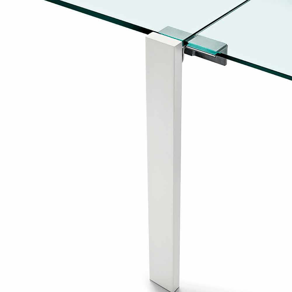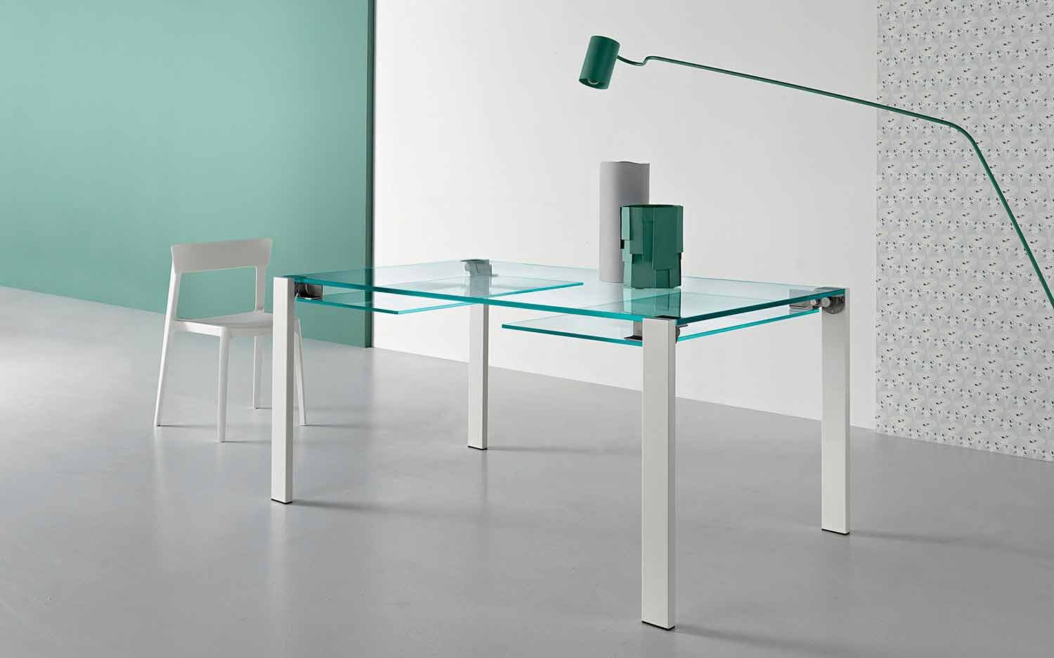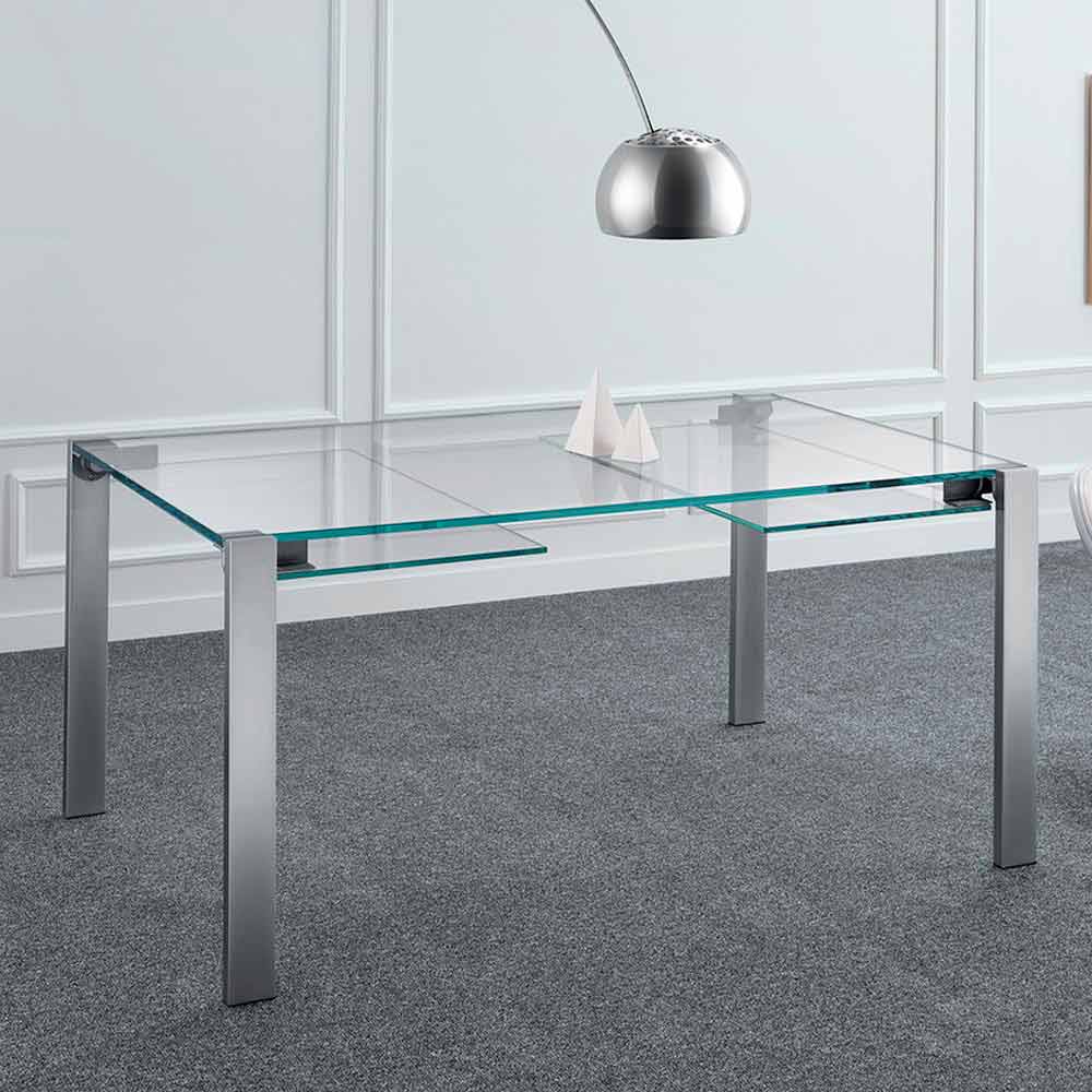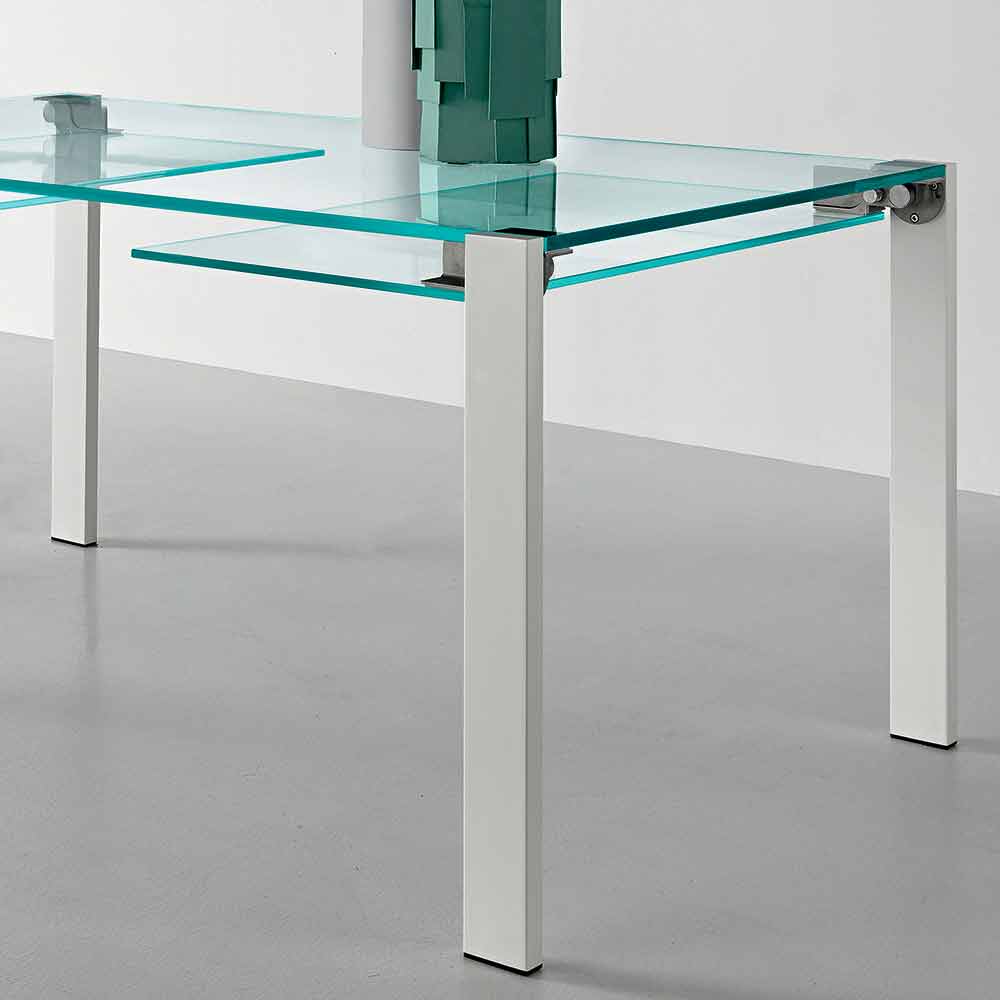 Masă din sticlă extra-transparentă, extensibilă până la 280 cm, cu bază metalică cromată sau vopsită în alb, realizată în Italia.