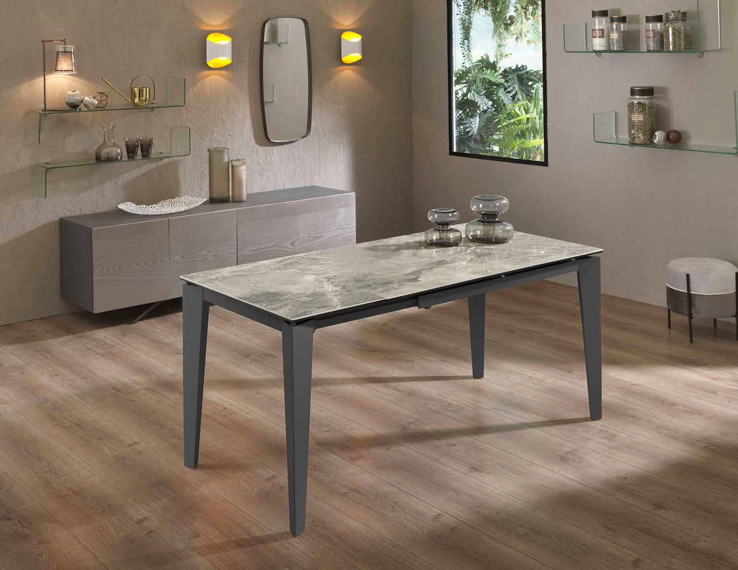 Syrta este o masă de luat masa dreptunghiulară caracterizată prin posibilitatea de a fi extinsă până la 170 cm pentru a obține, atunci când este necesar, mai mult spațiu la masă și, în consecință, un confort mai mare, ideal pentru a găzdui prieteni și rude fără a sacrifica confortul. Masa este realizată cu o structură metalică vopsită și blat din ceramică pe sticlă temperată de culoare antracit, care face masa elegantă și rezistentă în același timp și este, de asemenea, completată cu extensii interioare, de asemenea , ceramice pe sticlă albă.