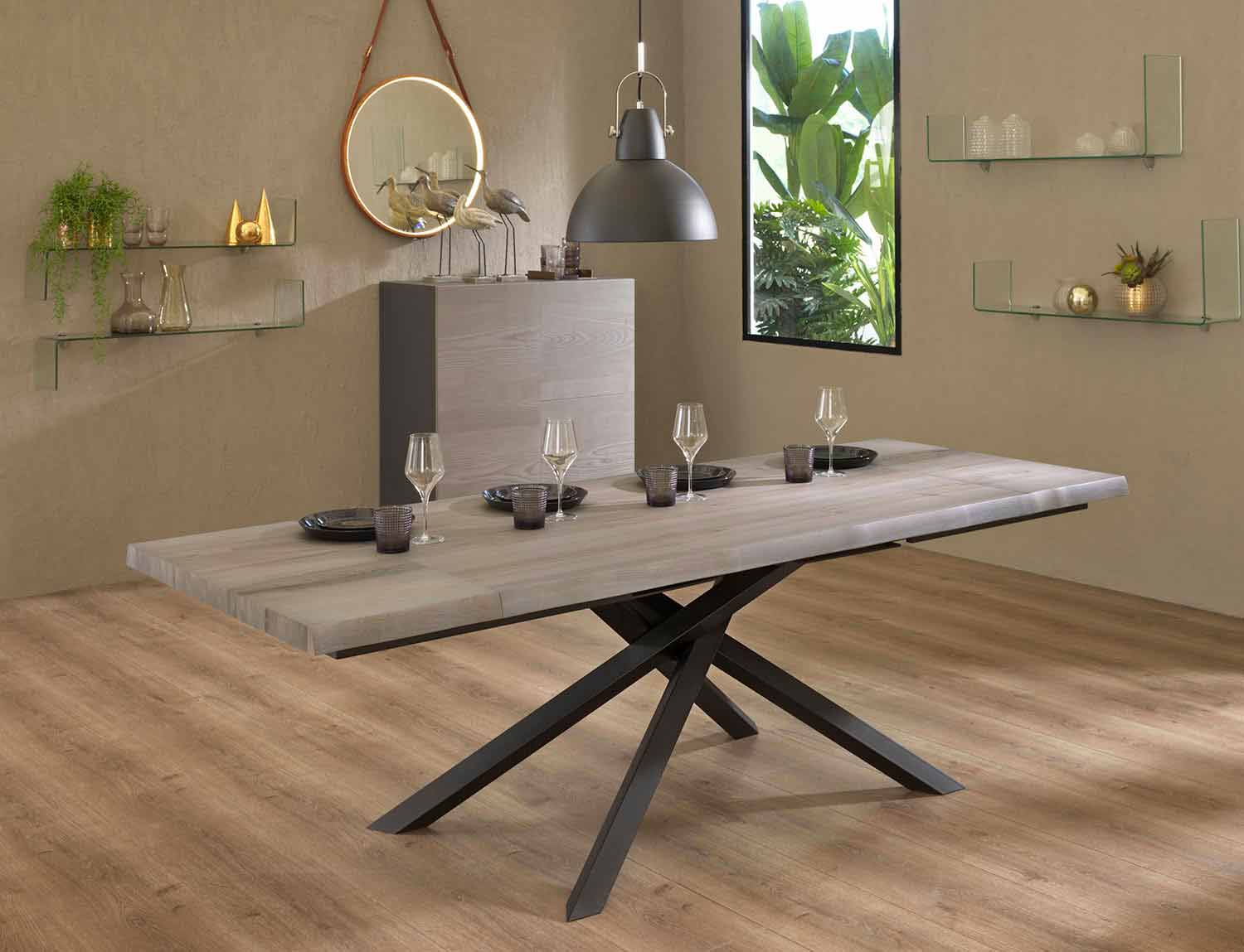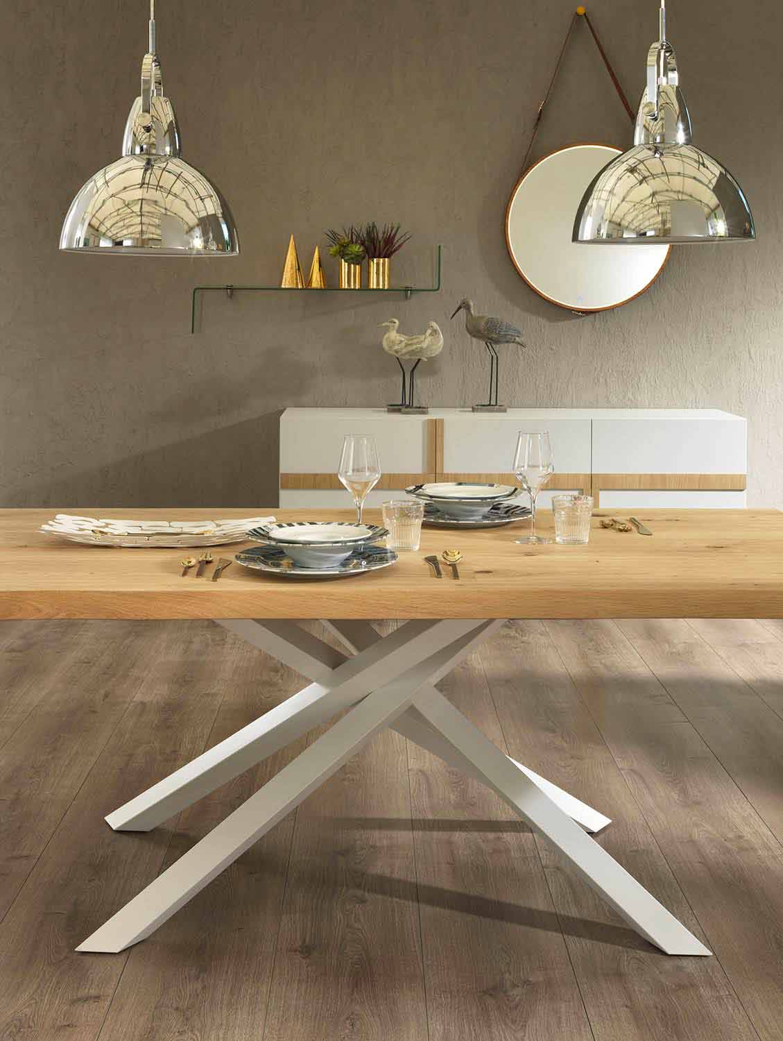Xino este realizat cu o bază metalică vopsită disponibilă în două culori și un blat din lemn disponibil și în două finisaje diferite și se caracterizează și prin posibilitatea de a fi extins până la 240 sau 300 cm datorită extensiilor exterioare, de asemenea, în furnir de frasin gri, astfel obținând mai mult spațiu și permițându-vă să găzduiți prieteni și rude fără a fi nevoie să renunțați la confort.