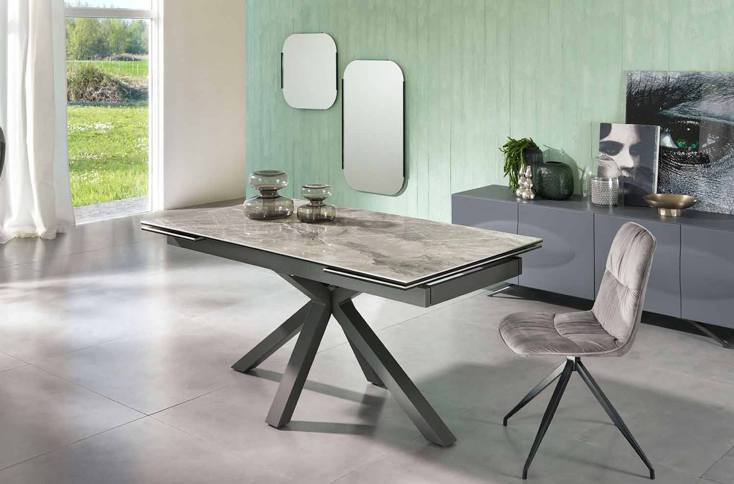 Laryssa este o masă de luat masa caracterizată prin utilizarea unor materiale inovatoare și rezistente care o fac o masă perfectă pentru sufragerie sau bucătărie, combinând frumusețea și practicitatea, permițând astfel o utilizare optimă și conferind în același timp stil oricărui mediu. Masa este realizată cu o structură metalică vopsită cu antracit și un blat din ceramică pe sticlă călită, tot de culoare antracit, ceea ce face masa solidă și rezistentă. Extensiile se află în interiorul mesei și sunt realizate și din ceramică pe sticlă de culoare antracit.