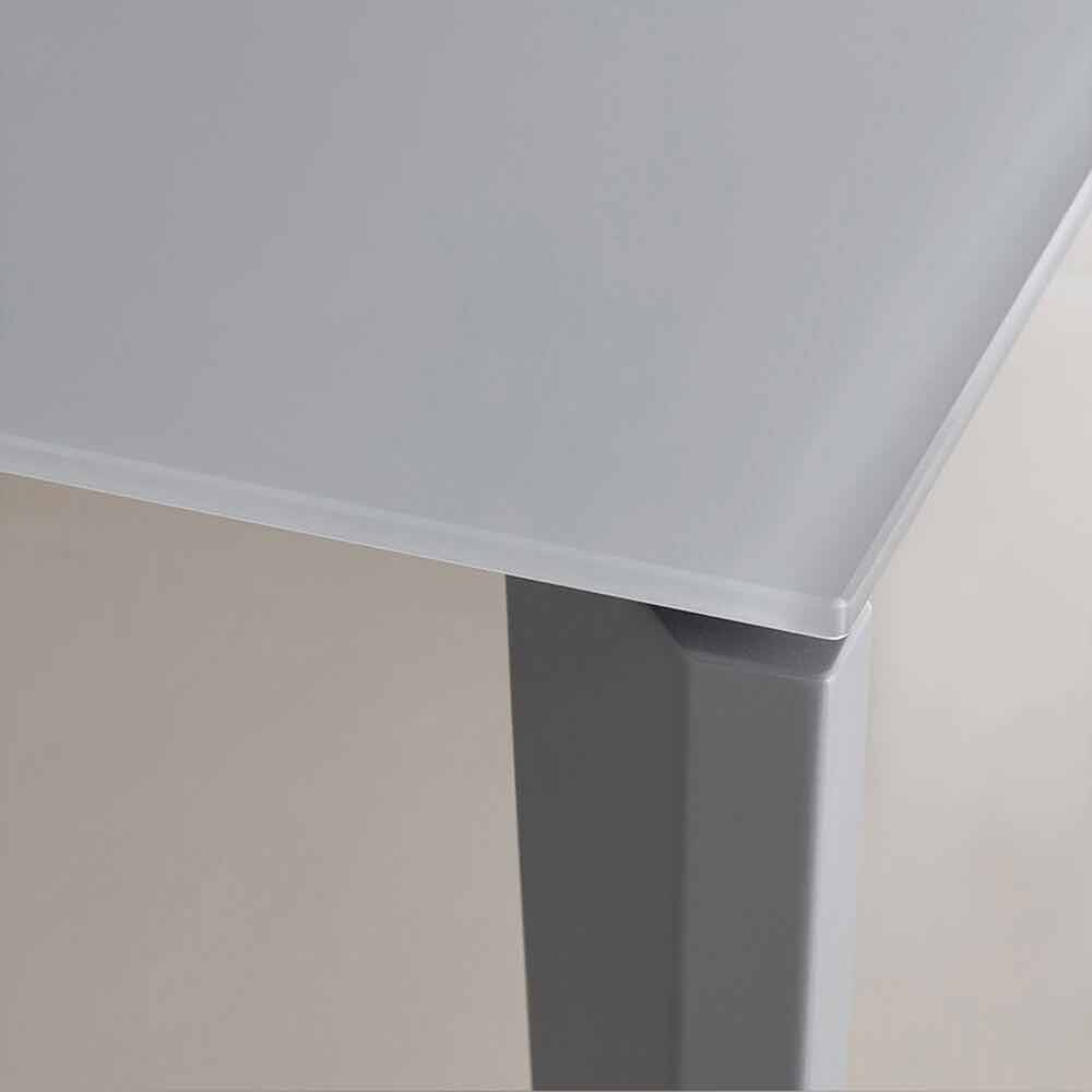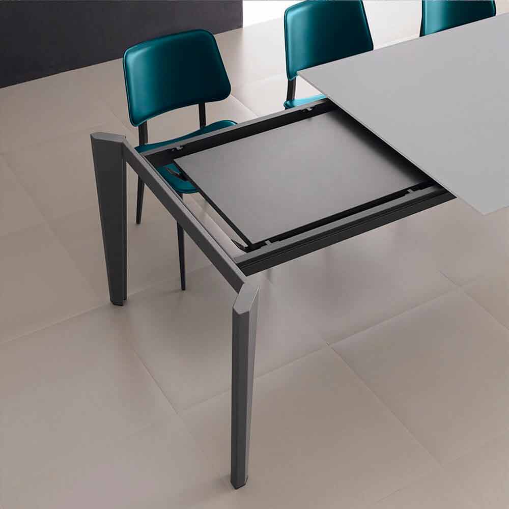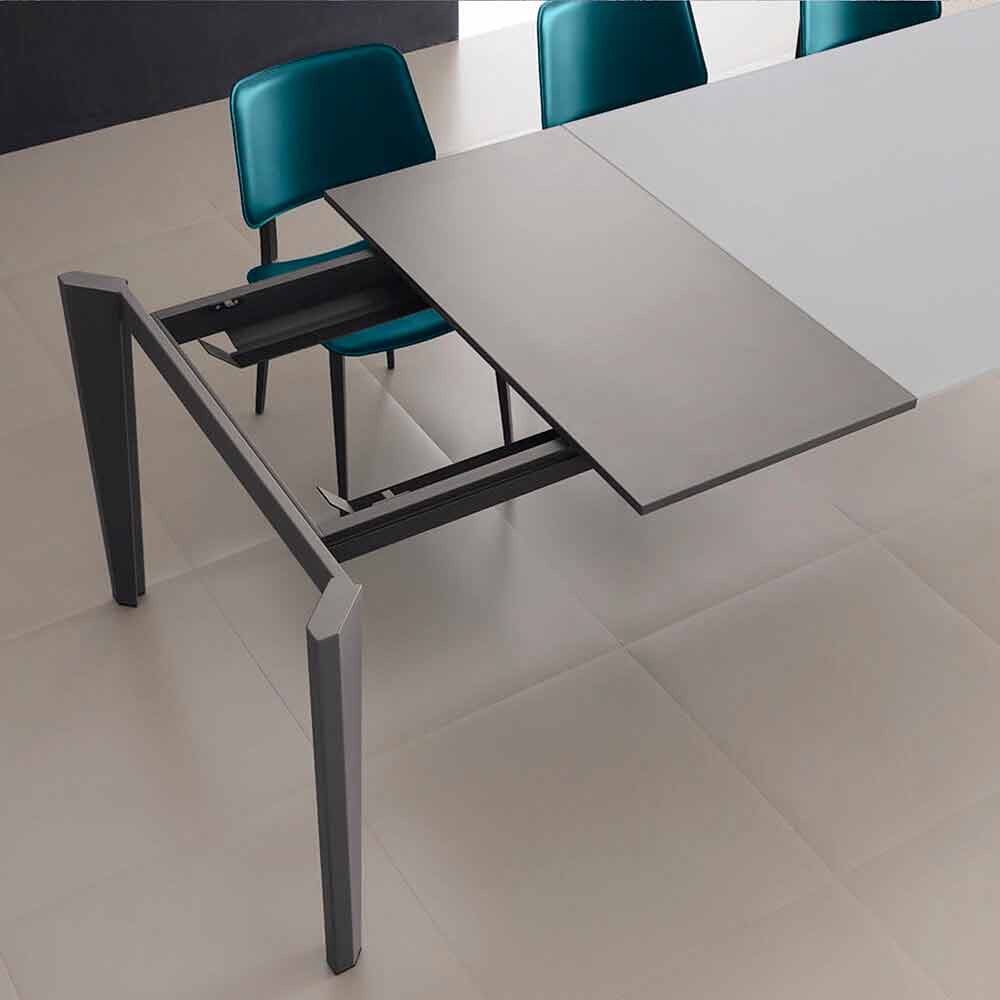 Masă de luat masa fabricată în Italia cu blat extensibil din sticlă satinată anti-amprentă (grosime 10mm) cu finisaj pudră, extensie din melamină antracit și bază din metal vopsit antracit .