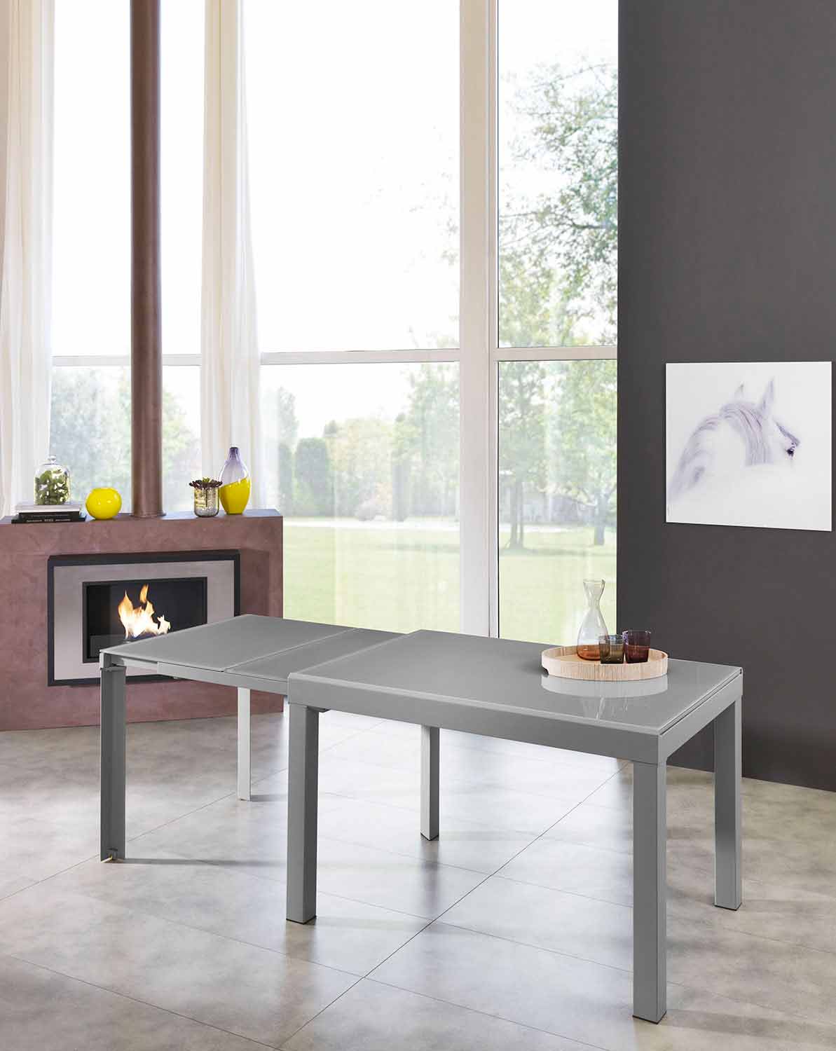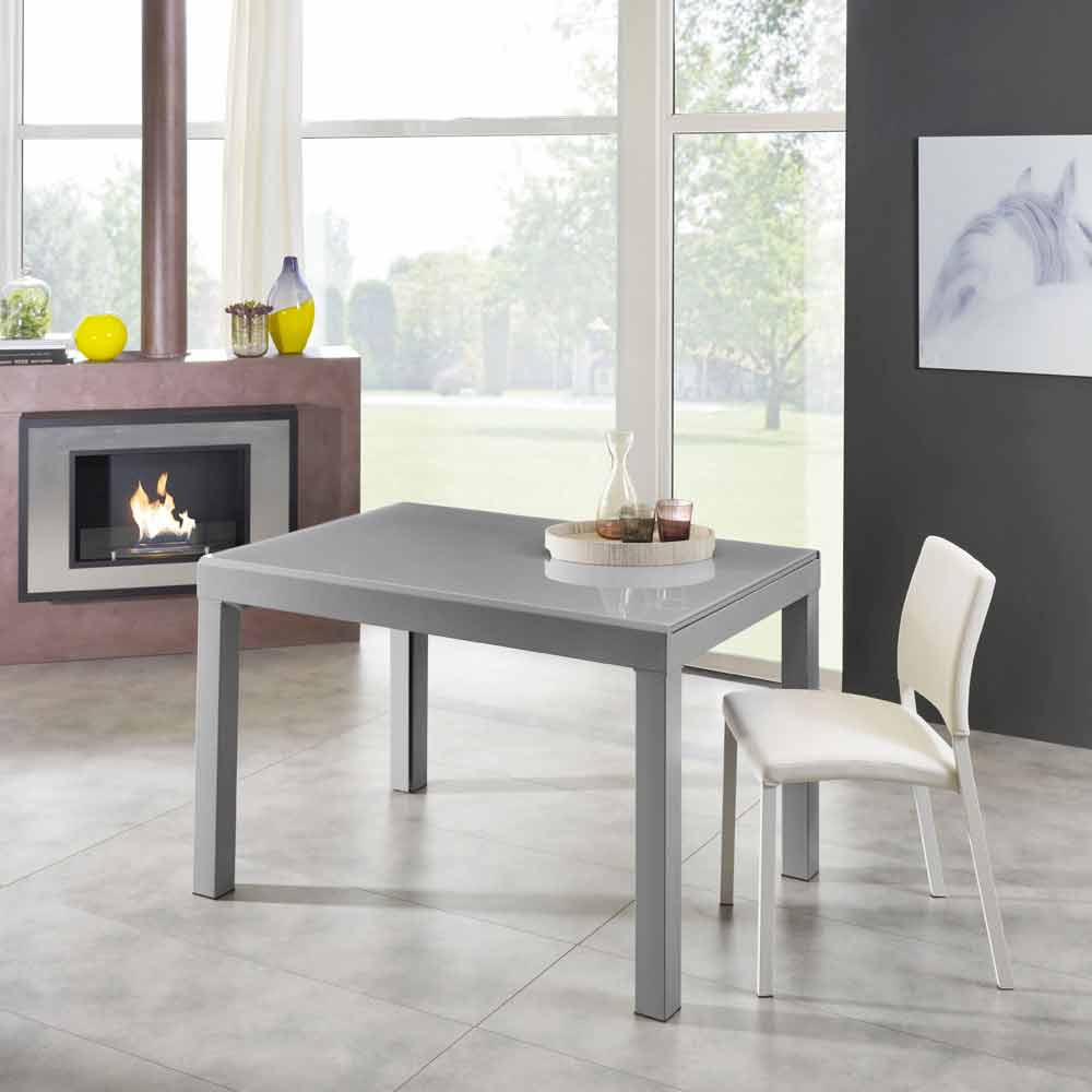 Masa este realizată cu o structură metalică vopsită gri și blat din sticlă și melamină temperată de aceeași culoare, precum și extensii interioare, tot din sticlă gri gri.