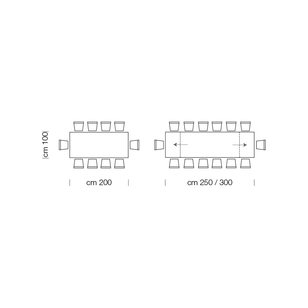 - L 200 (300) x D 100 x H 76,5 cm 14 locuri extensibile cu 2 extensii exterioare de 50 cm.