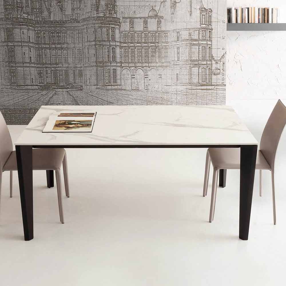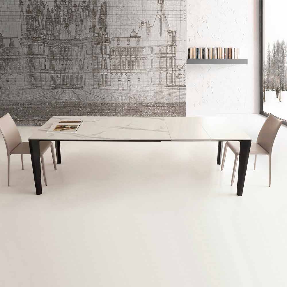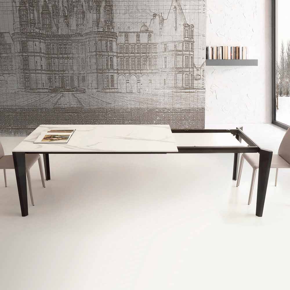 Masă de luat masa fabricată în Italia cu blat extensibil din sticlă ceramică (12 mm grosime) cu finisaj cu efect de marmură albă Calacatta, extensie melaminică albă și bază din metal vopsit negru.