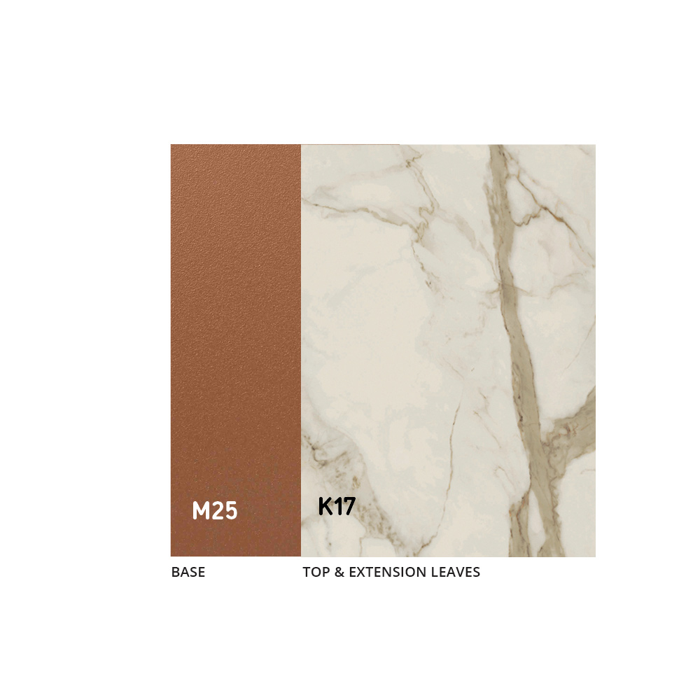 Masă realizată cu cadru metalic vopsit în relief cu cupru și blat ceramic de 3 mm.