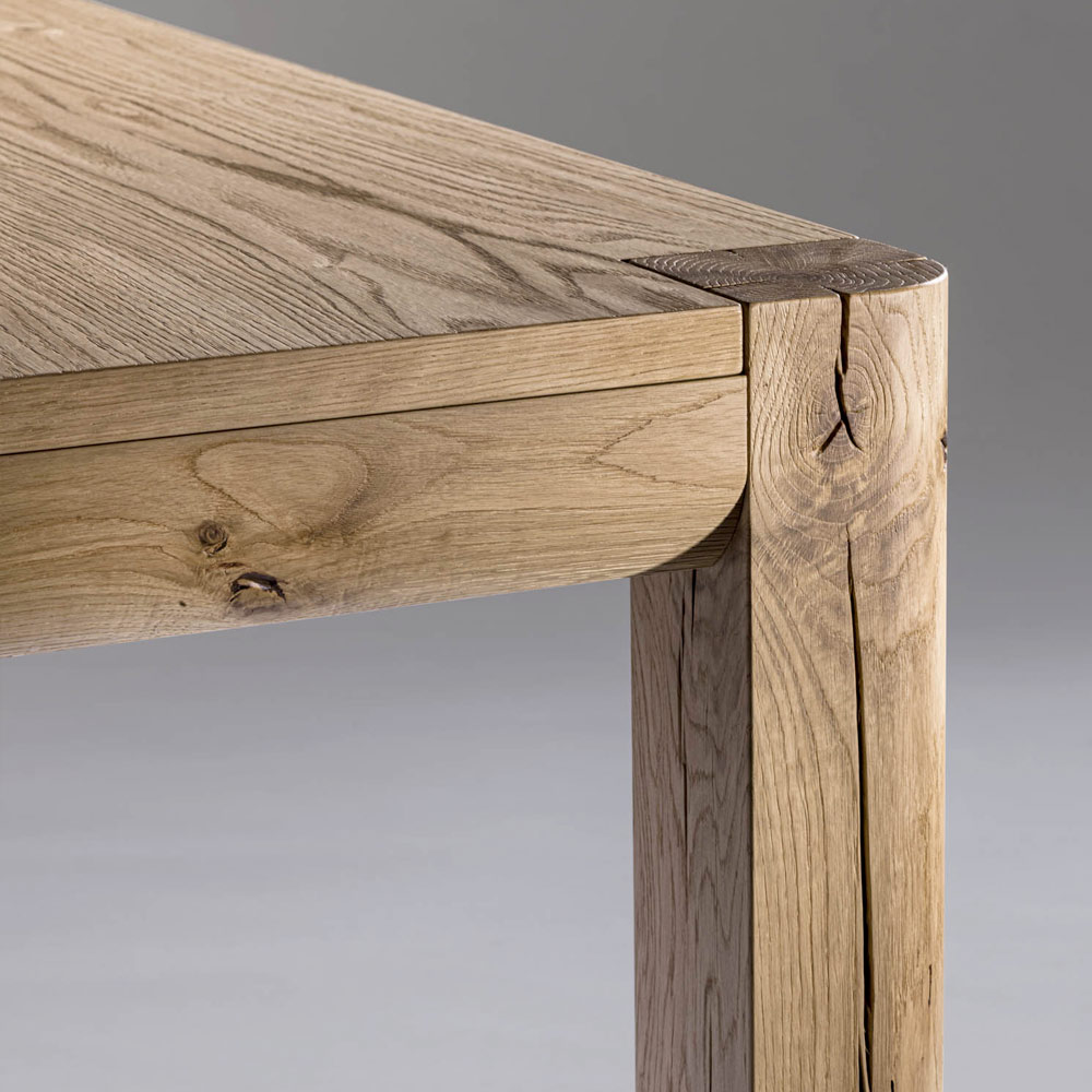 Masă extensibilă cu blat din lemn furniruit de stejar natural și picioare pătrate solide cu crăpături și noduri 12x12cm. Dimensiuni H 77 cm, grosime 3 cm.