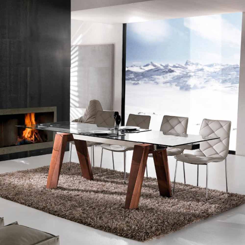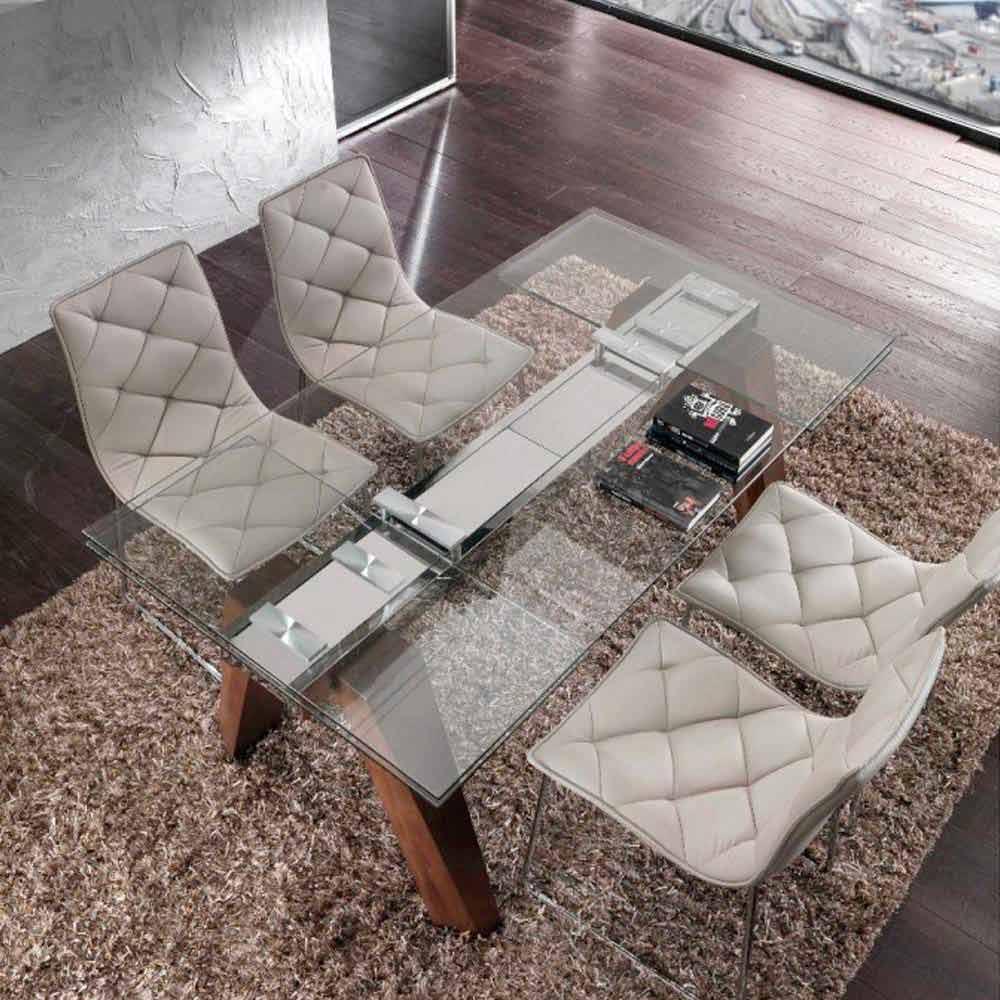 Masă extensibilă din Ciad cu blat din sticlă transparentă, structură din oțel inoxidabil lustruit și picioare din lemn masiv colorat cu nuc american.