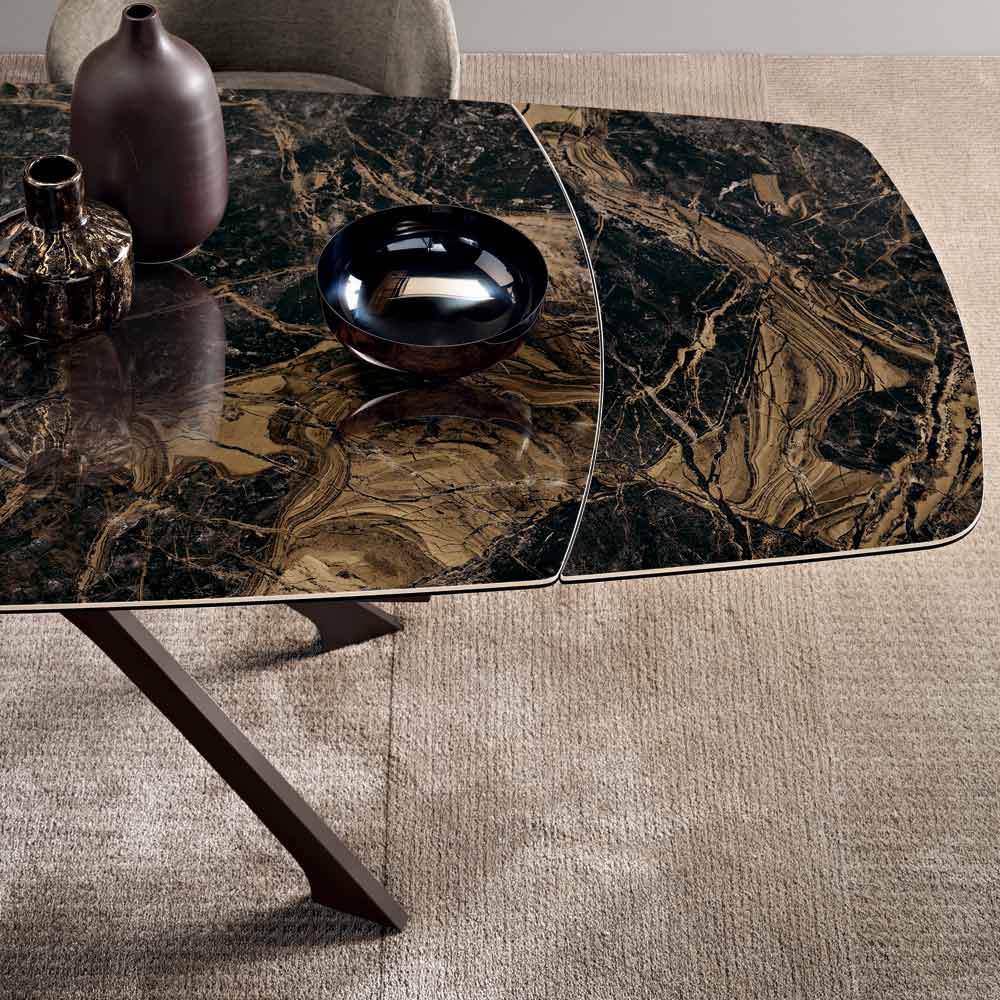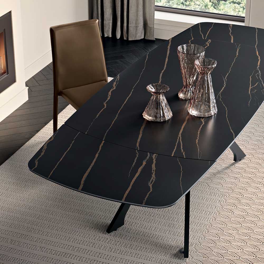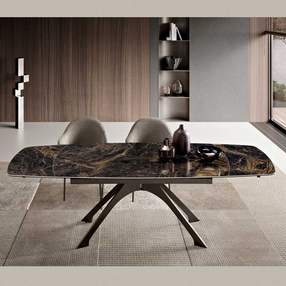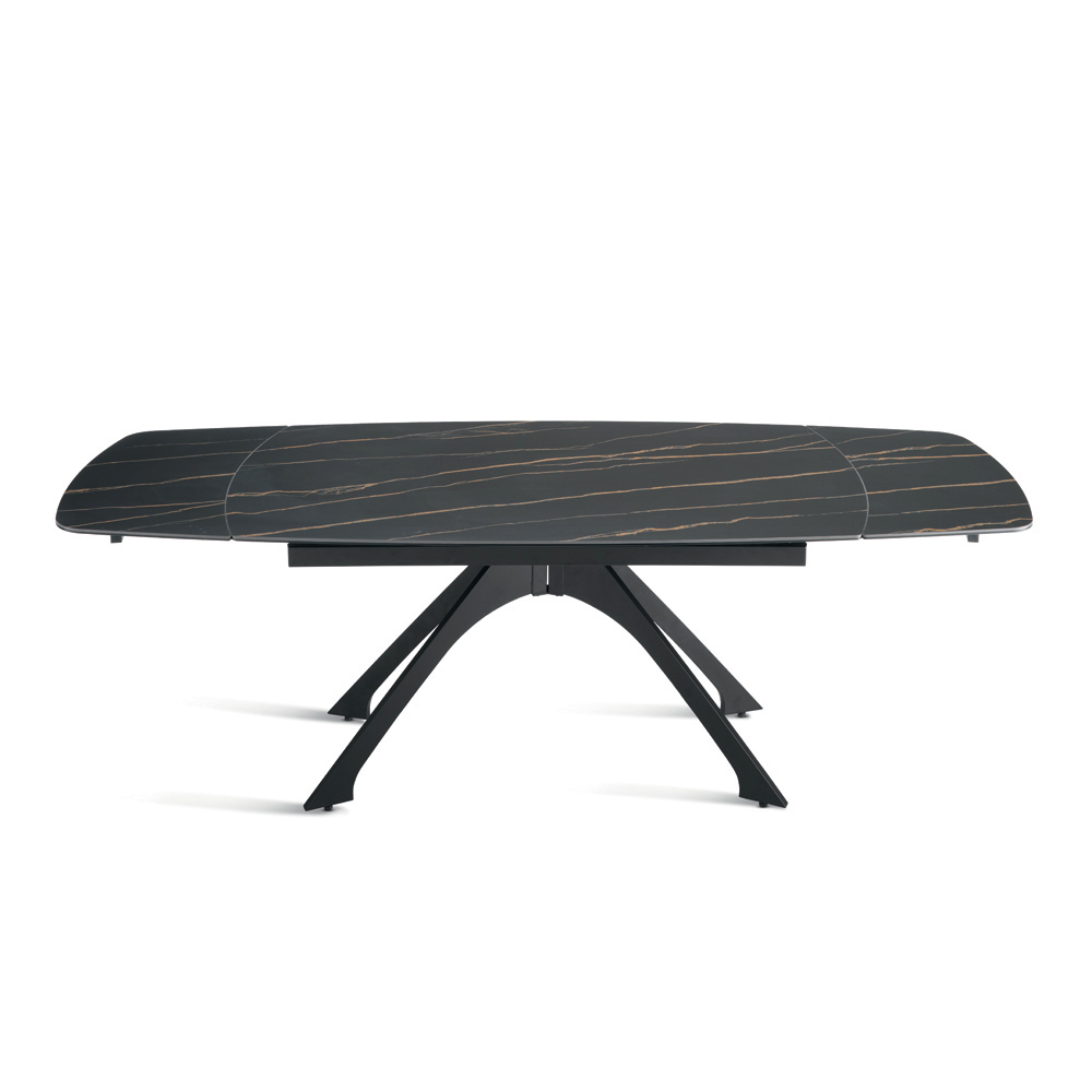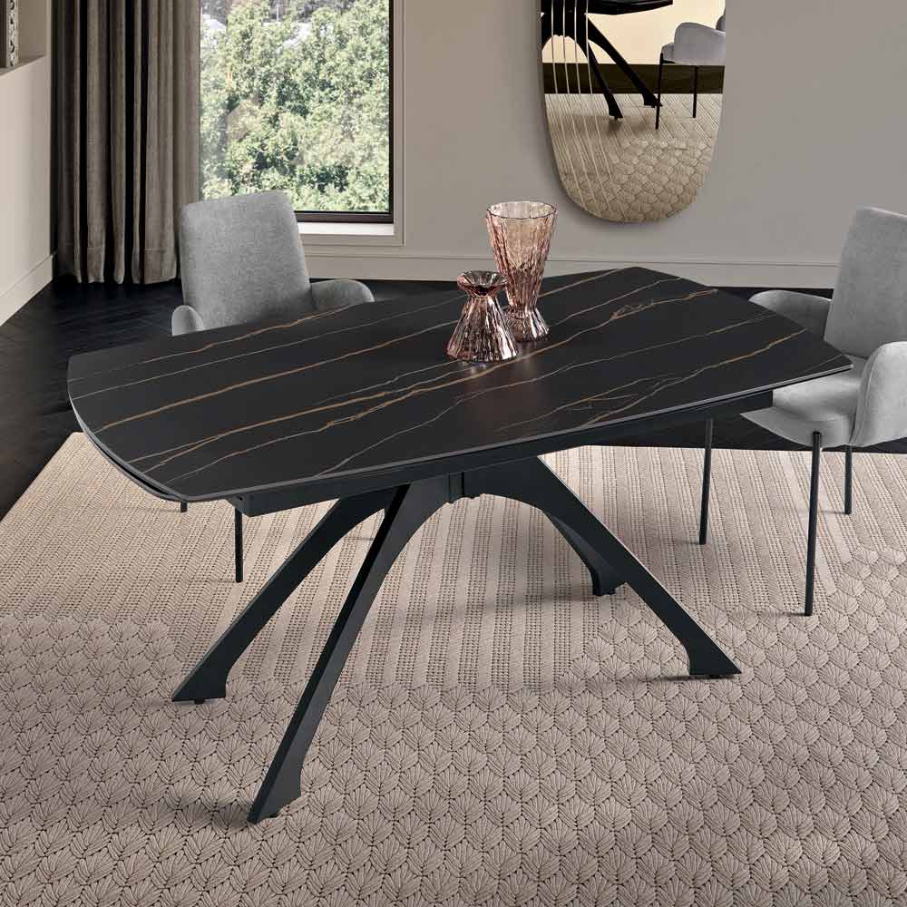 O masă de sufragerie modernă, extensibilă, cu un design contemporan și funcțional, ideală pentru a mobila elegant sufrageria sau livingul . Structura are o bază elegantă din metal vopsit, compusă din patru picioare subțiri care formează două arcade simetrice, creând o structură dinamică și ușoară, cu un impact estetic puternic.