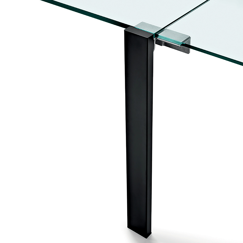 Masă din sticlă extraclară, extensibilă până la 170 cm, cu bază metalică, fabricată în Italia.