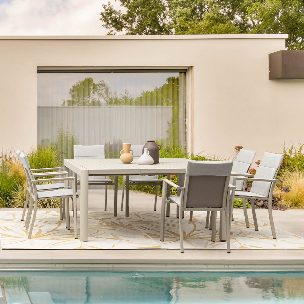 Această masă de grădină este o adevărată bijuterie a designului minimalist și funcțional . Suprafața sa din aluminiu de înaltă calitate, caracterizată de linii curate, evocă un stil modern și sofisticat care nu trece neobservat. Culorile neutre o fac extrem de versatil si potrivit pentru orice mediu exterior, de la balconul urban pana la curtea unei vile la tara. Nu numai plăcut din punct de vedere estetic, ci și extrem de practic și durabil ; Această masă este construită pentru a rezista la intemperii, asigurând durabilitate și stabilitate în timp. Cu liniile sale simple și silueta elegantă, această masă devine protagonista oricărui moment convivial în aer liber, oferind confort și ospitalitate maxim. O expresie a stilului pur contemporan , această masă de grădină este alegerea ideală pentru cei cărora le place să-și întâmpine, să trăiască și să-și împărtășească viața în aer liber cu clasă și simplitate .
