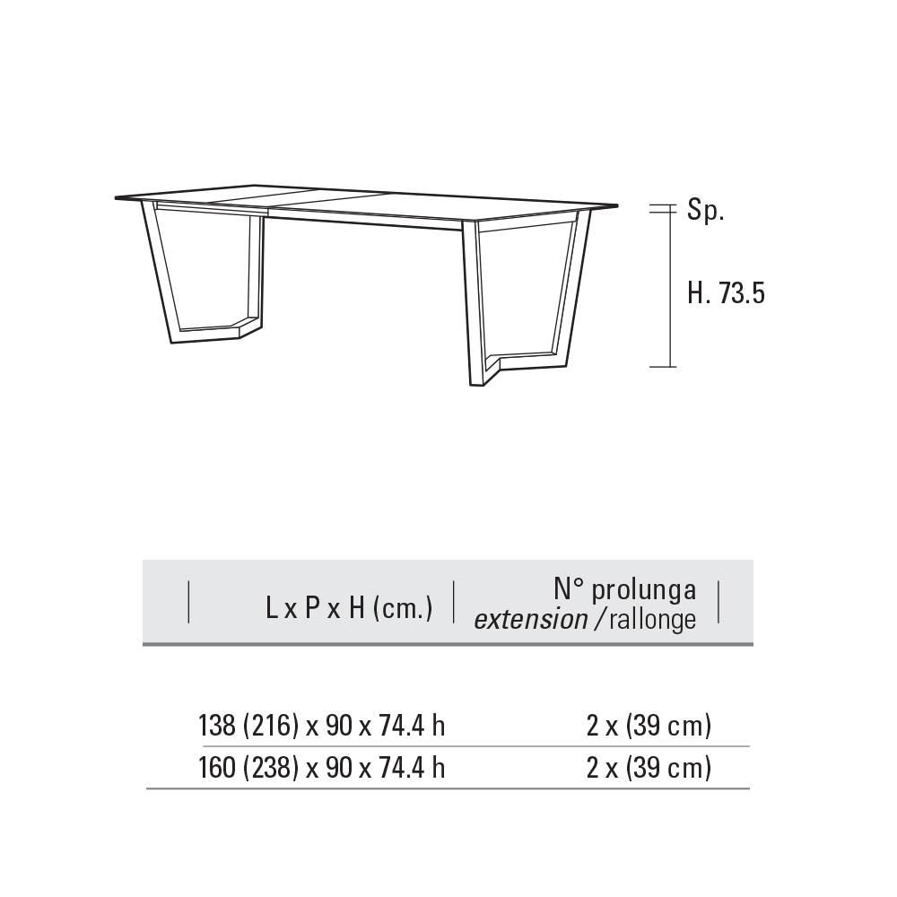 - L 160/238 x D 90 x H 74,4 cm.