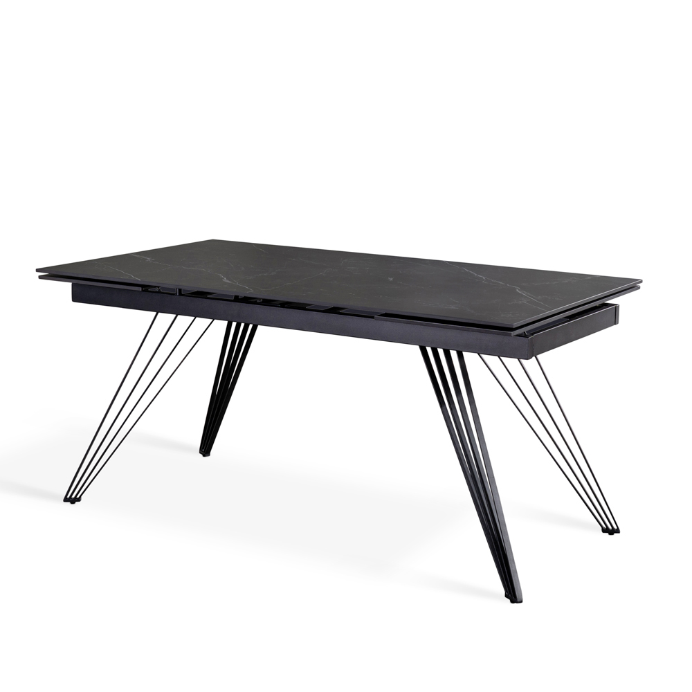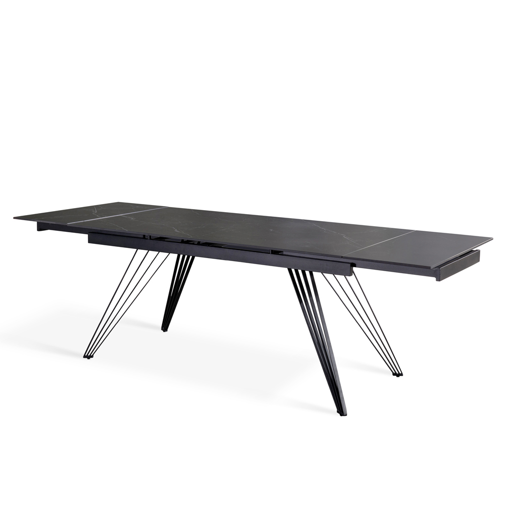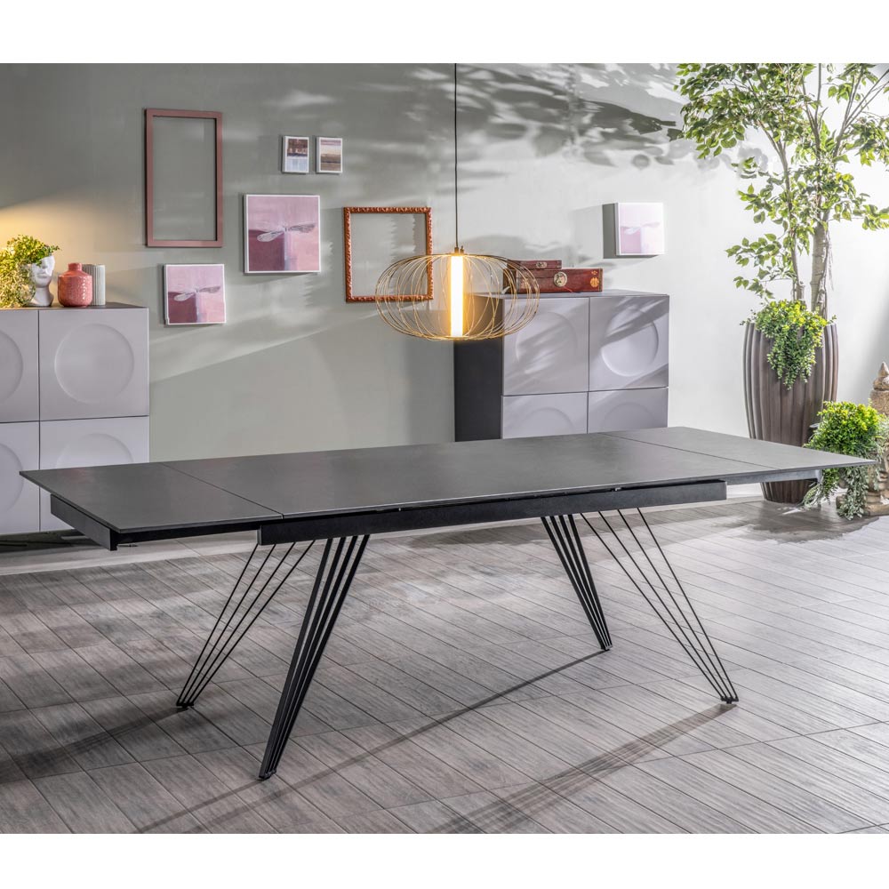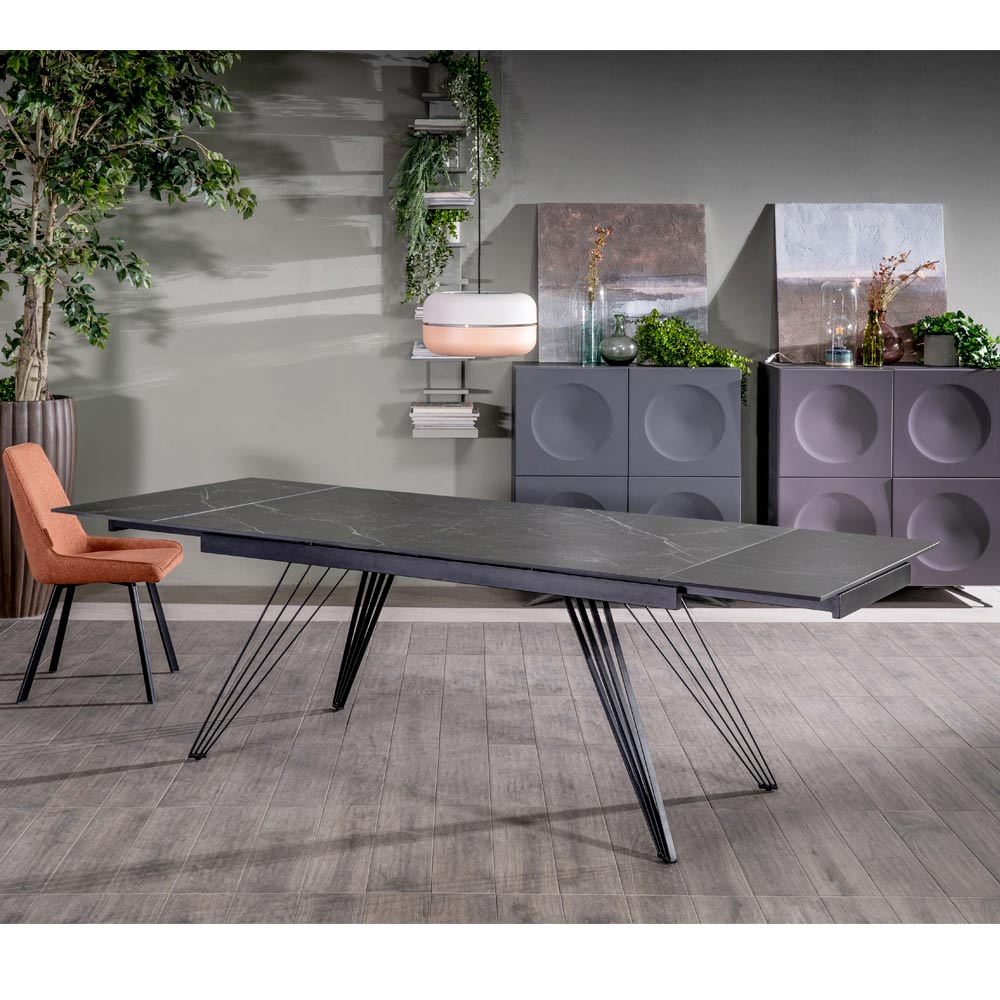 Ceea ce captează atenția este forța expresivă a acestei mese extensibile într-un stil contemporan și industrial. Designul său este caracterizat de blatul elegant din ceramică care se potrivește cu gust cu baza solidă din metal. Oferă numeroase combinații posibile între finisajele blatului dreptunghiular și finisajul bazei, satisfacând expresia și gustul personal și reflectând spiritul contextului în care este introdus. Datorită extensibilității sale, poate găzdui până la 10 persoane și devine aliatul perfect în crearea unor spații conviviale unice și calde.