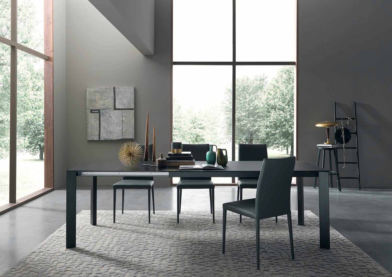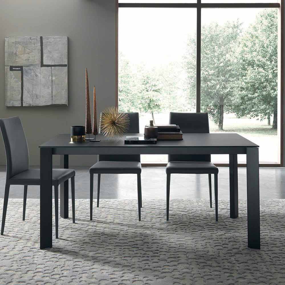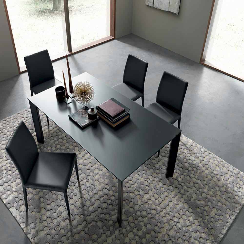 Masa de sufragerie extensibila moderna cu blat din sticla si picioare metalice Made in Italy.