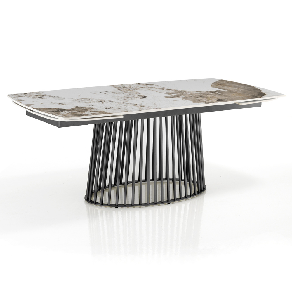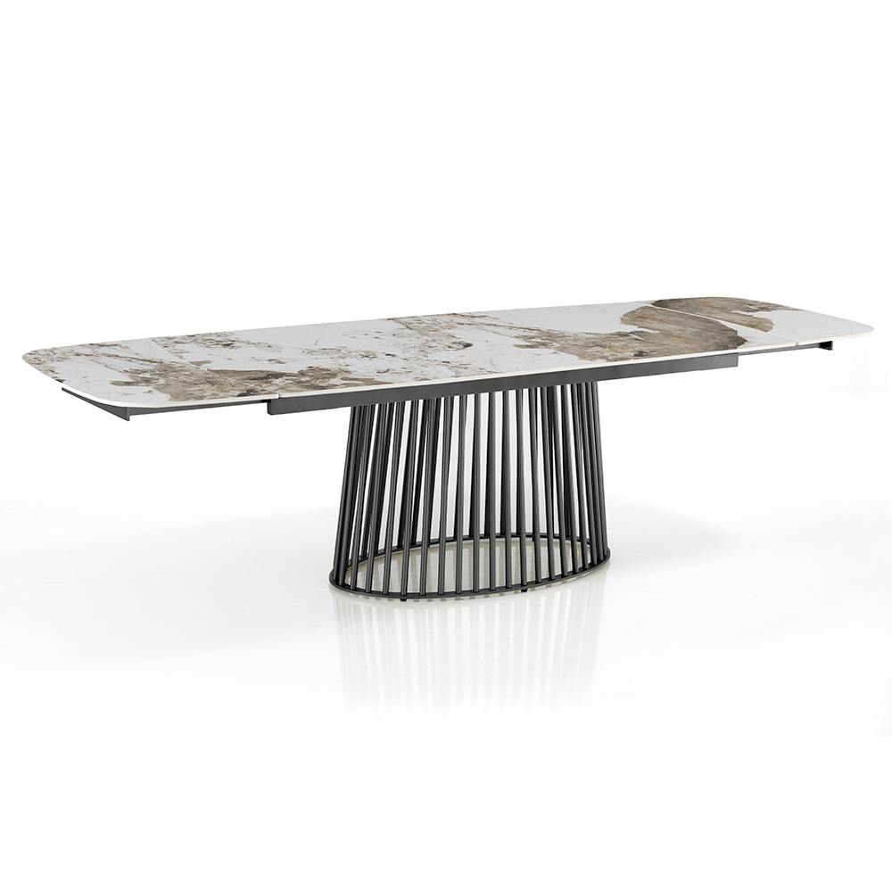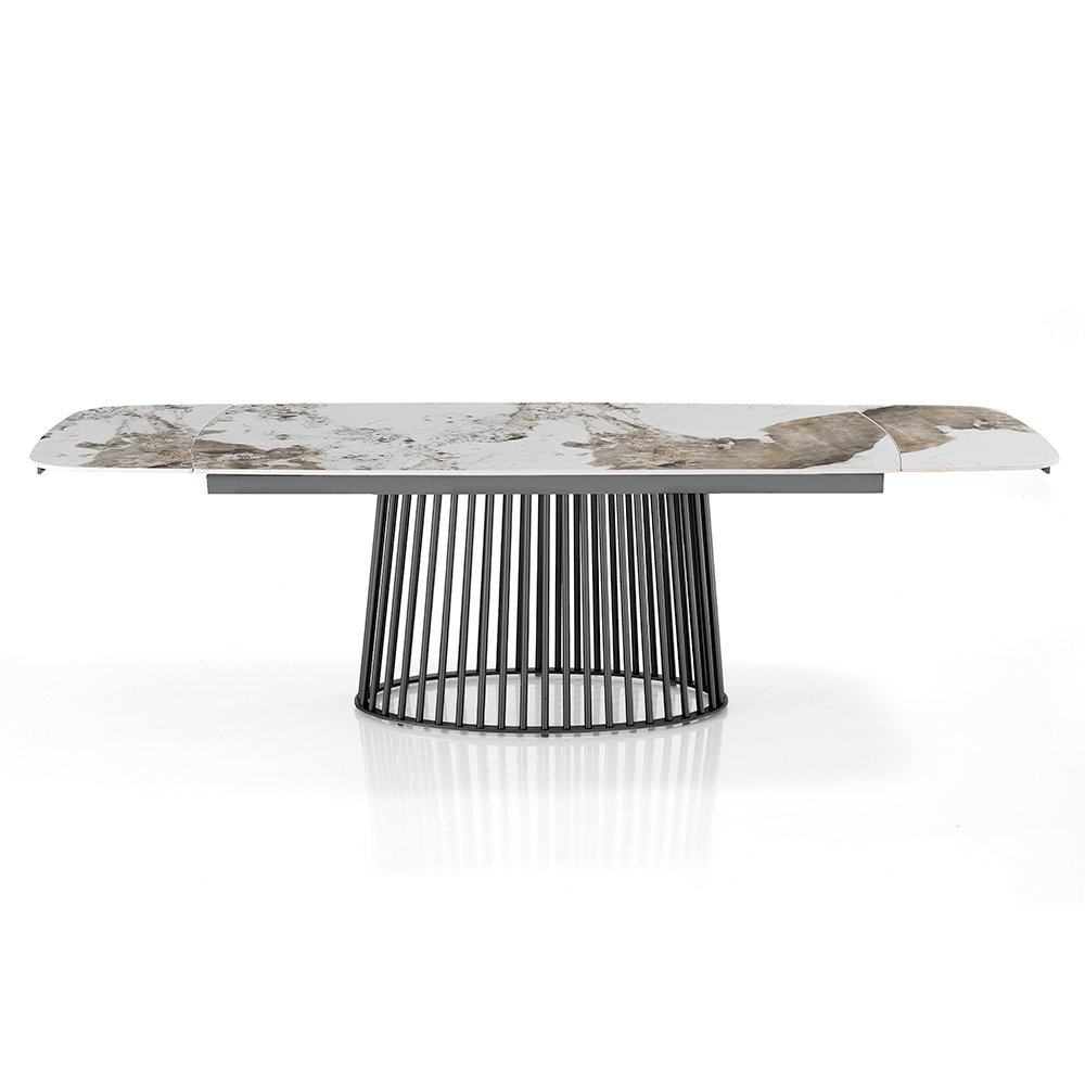 Susținută de o bază metalică care prezintă un design complex cu nervuri, această masă combină robustețea și stilul sculptural . Capacitatea de a se întinde oferă o versatilitate excepțională, potrivindu-se perfect atât în cine intime, cât și în adunări mari, asigurând că orice ocazie este găzduită cu eleganță.