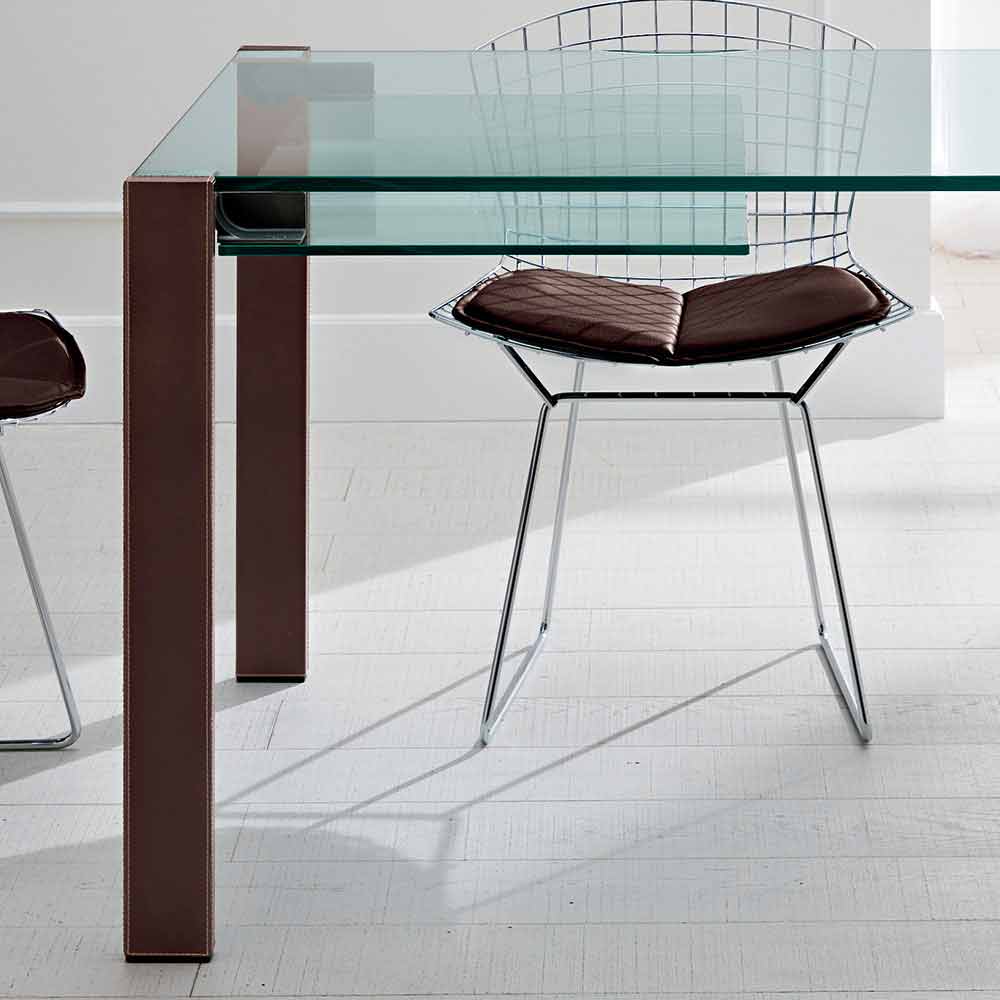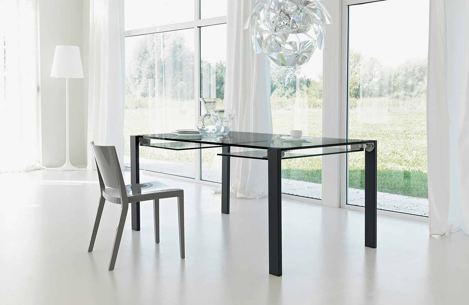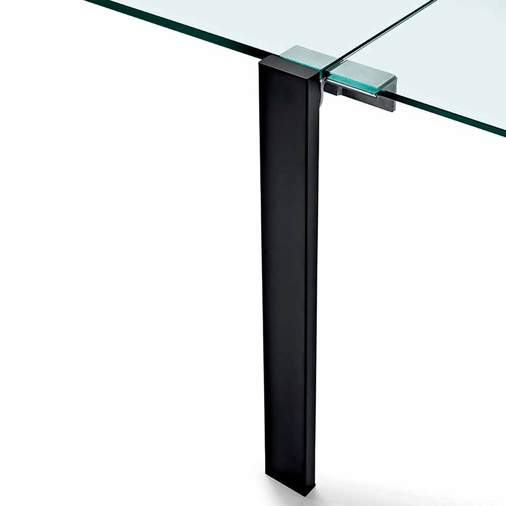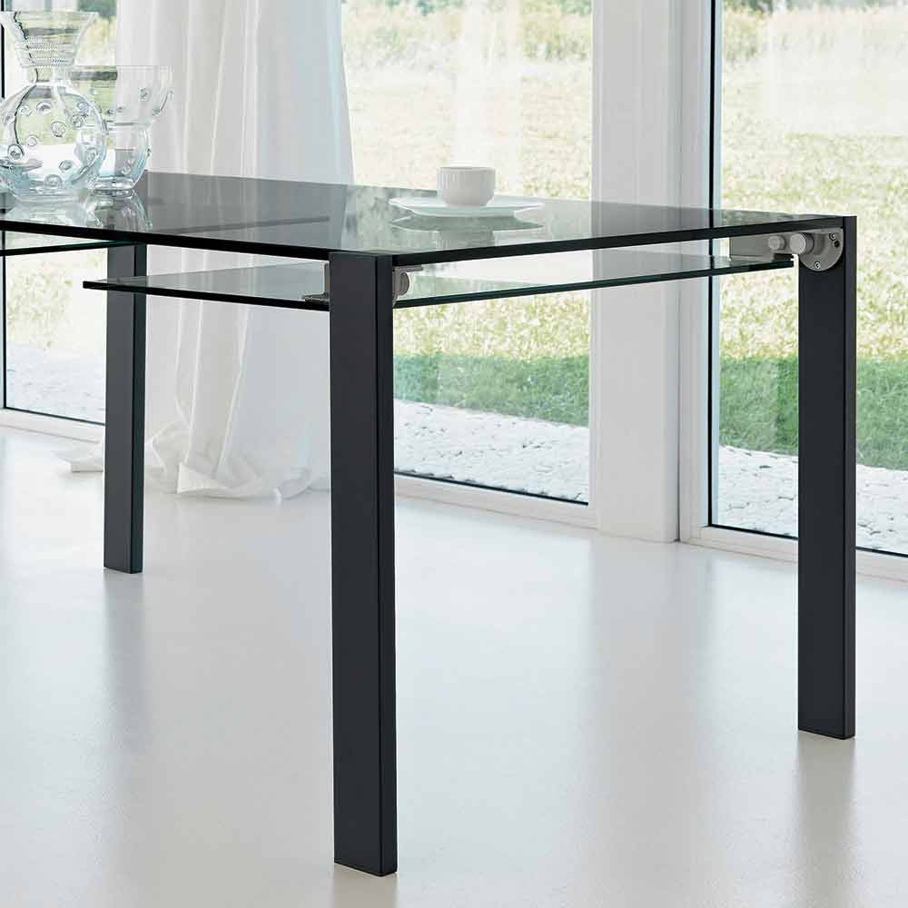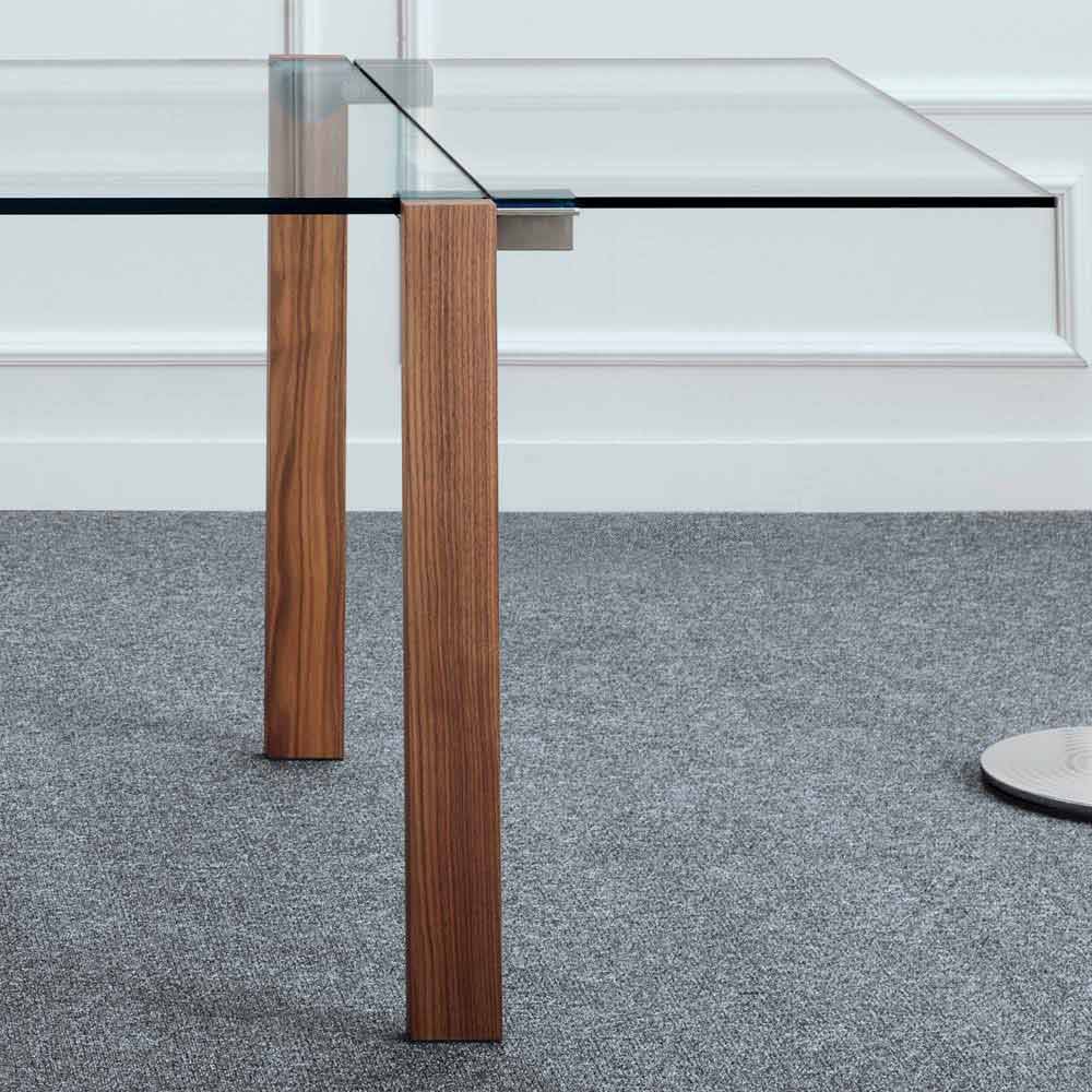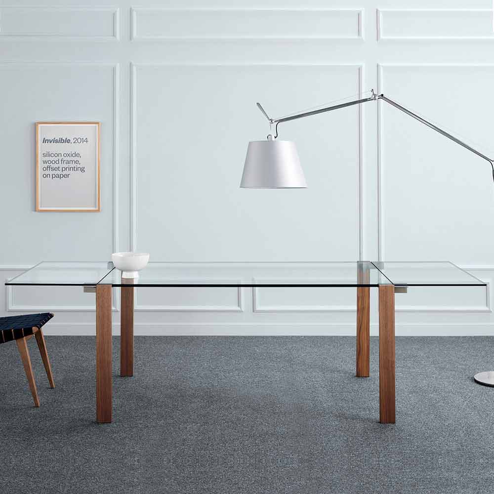 Masă transparentă din sticlă extensibilă până la 12 locuri cu bază metalică sau nucă canaletto, realizată în Italia.