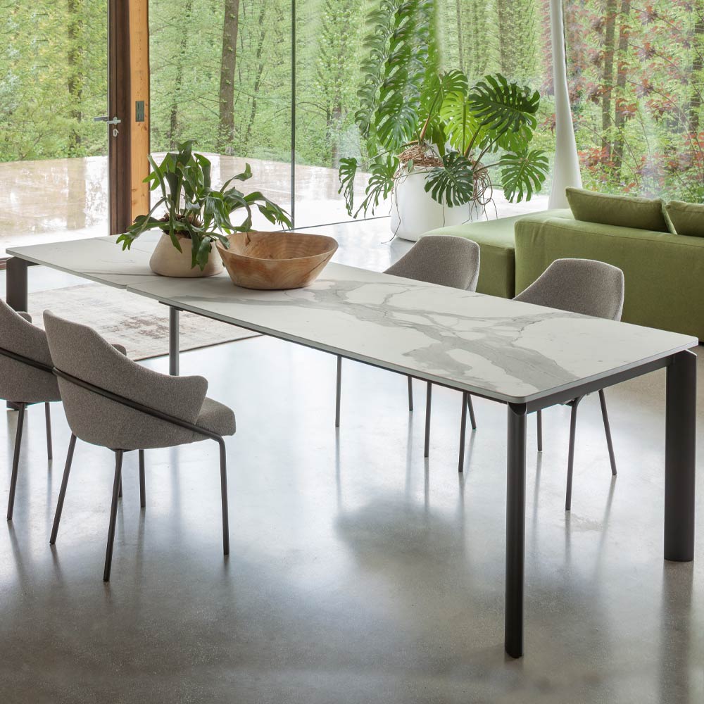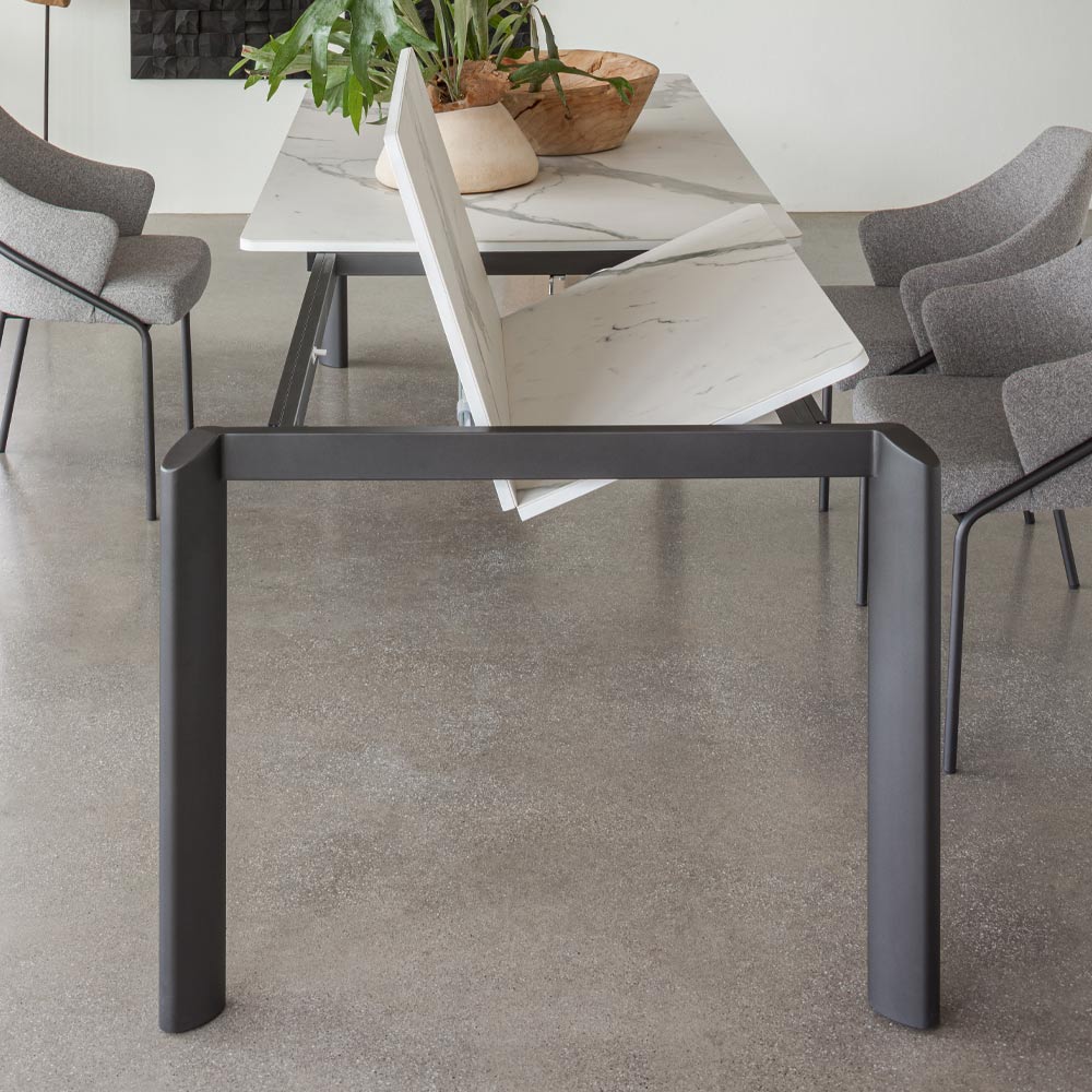 Made in Italy. Aceasta este o masă elegantă, cu o structură metalică extensibilă, cu un mecanism telescopic care vă permite să extindeți blatul mesei. Particularitatea designului este evidentă în picioarele mesei, care nu au margini, și în partea superioară cu colțuri rotunjite care contribuie la o estetică armonioasă și distinctă.
