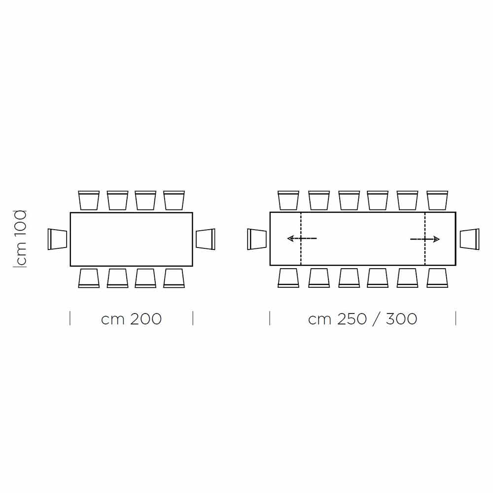 extensii de 40/50 cm fiecare , permite extinderea lungimii până la maxim 300 cm, găzduind până la 14 persoane, dovedindu-se a fi un mobilier. soluție potrivită în special pentru cei cărora le place să primească oaspeții acasă pentru prânzurile și cinele cu prietenii.