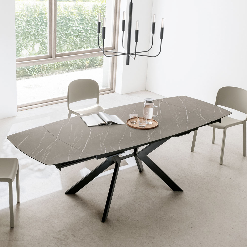 Eleganța și caracterul practic se combină în această masă extensibilă din HPL și metal , concepută pentru cei care își doresc o piesă de mobilier cu un impact vizual puternic, dar extrem de funcțională.