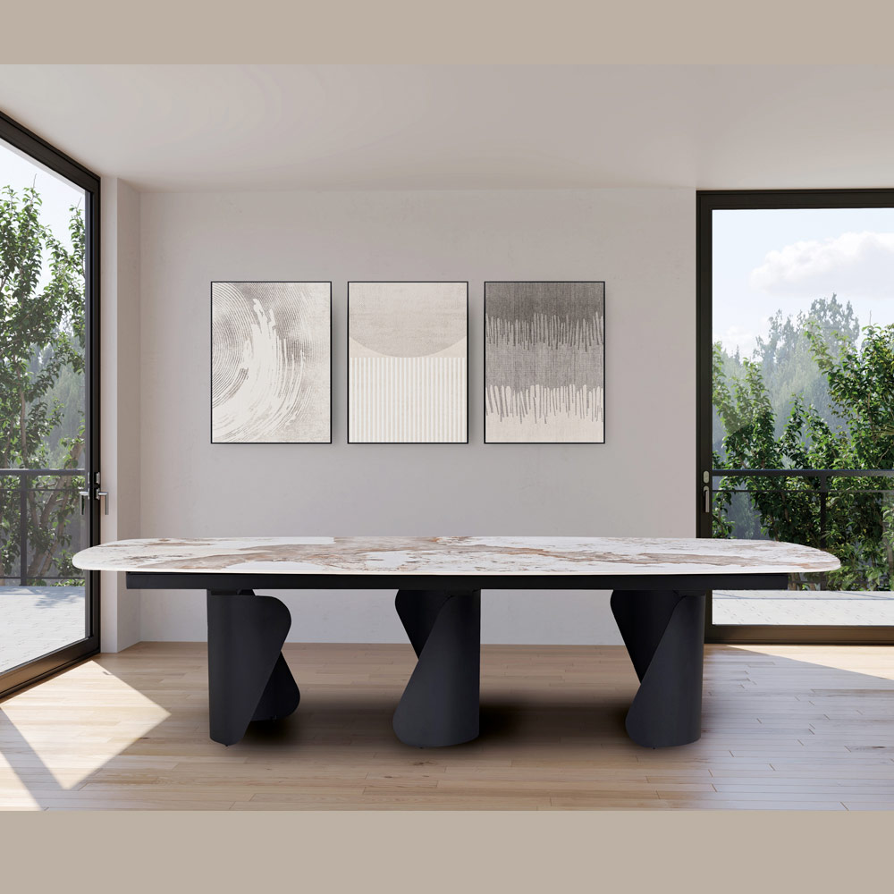 Concepută pentru spații mari, această masă este perfectă pentru sufragerii de lux, săli de ședințe sau medii de ospitalitate de înaltă calitate .