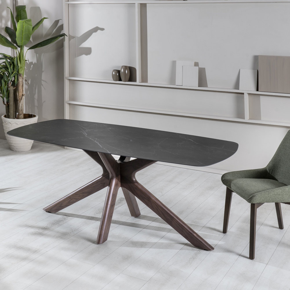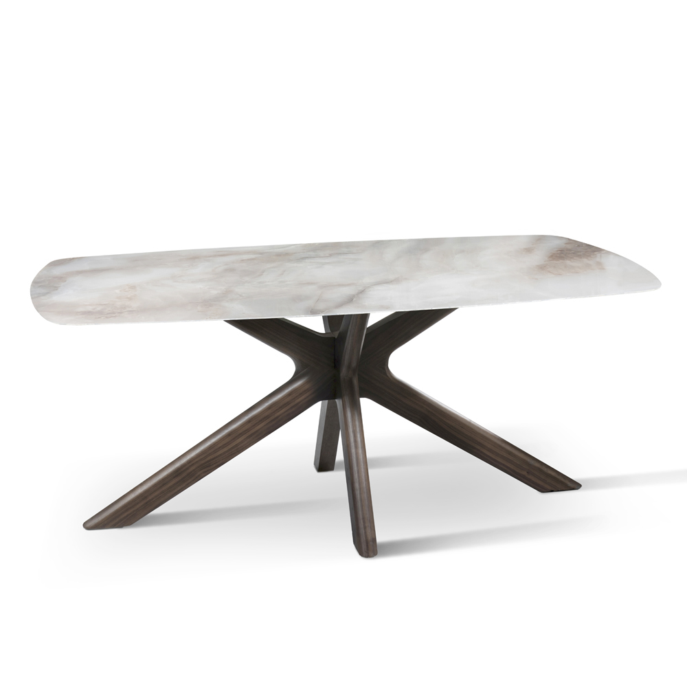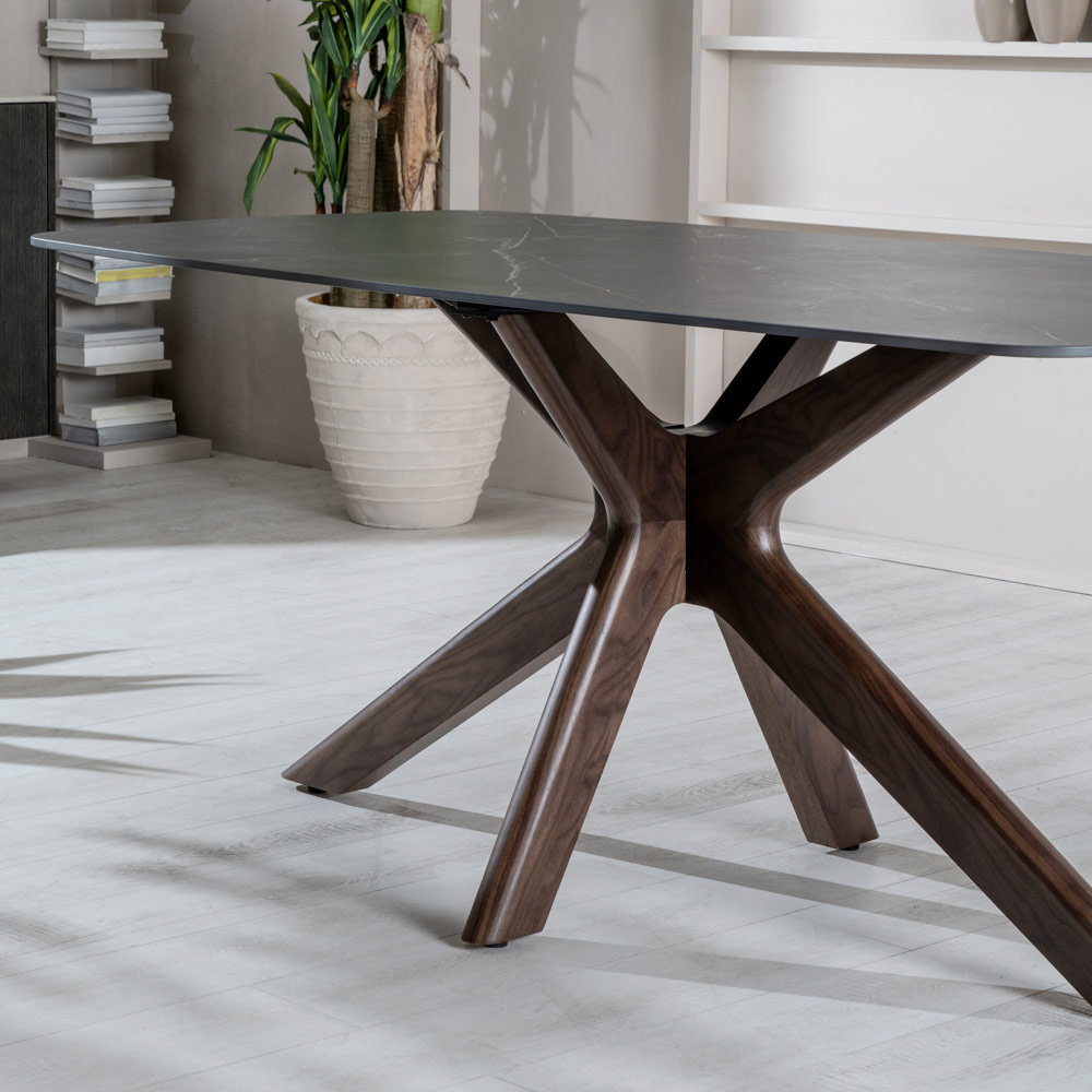 Este o masă rafinată și originală, în care liniile fluide și moi se joacă între ele, creând detalii de o mare putere vizuală. Blatul ceramic se sprijină delicat pe baza în formă de stea, din nuc masiv. Rezultat al cercetării care explorează cele mai diverse stiluri și inspirații, este un adevărat protagonist al zonei de zi, integrându-se armonios atât în medii cu design modern, cât și în spații care favorizează luxul și stilul clasic.