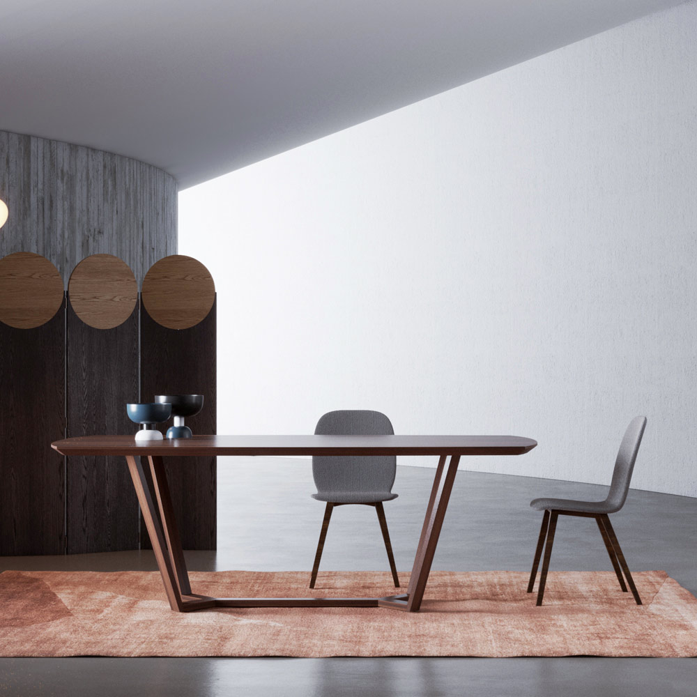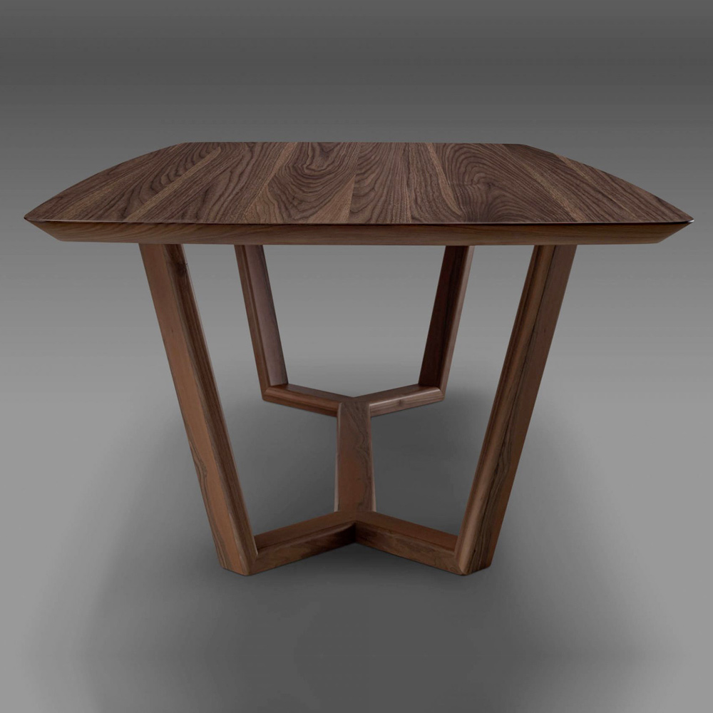 Masă fixă cu blat modelat și teșit pe placă furniruită de nuc canaletto și bază din lemn masiv.
