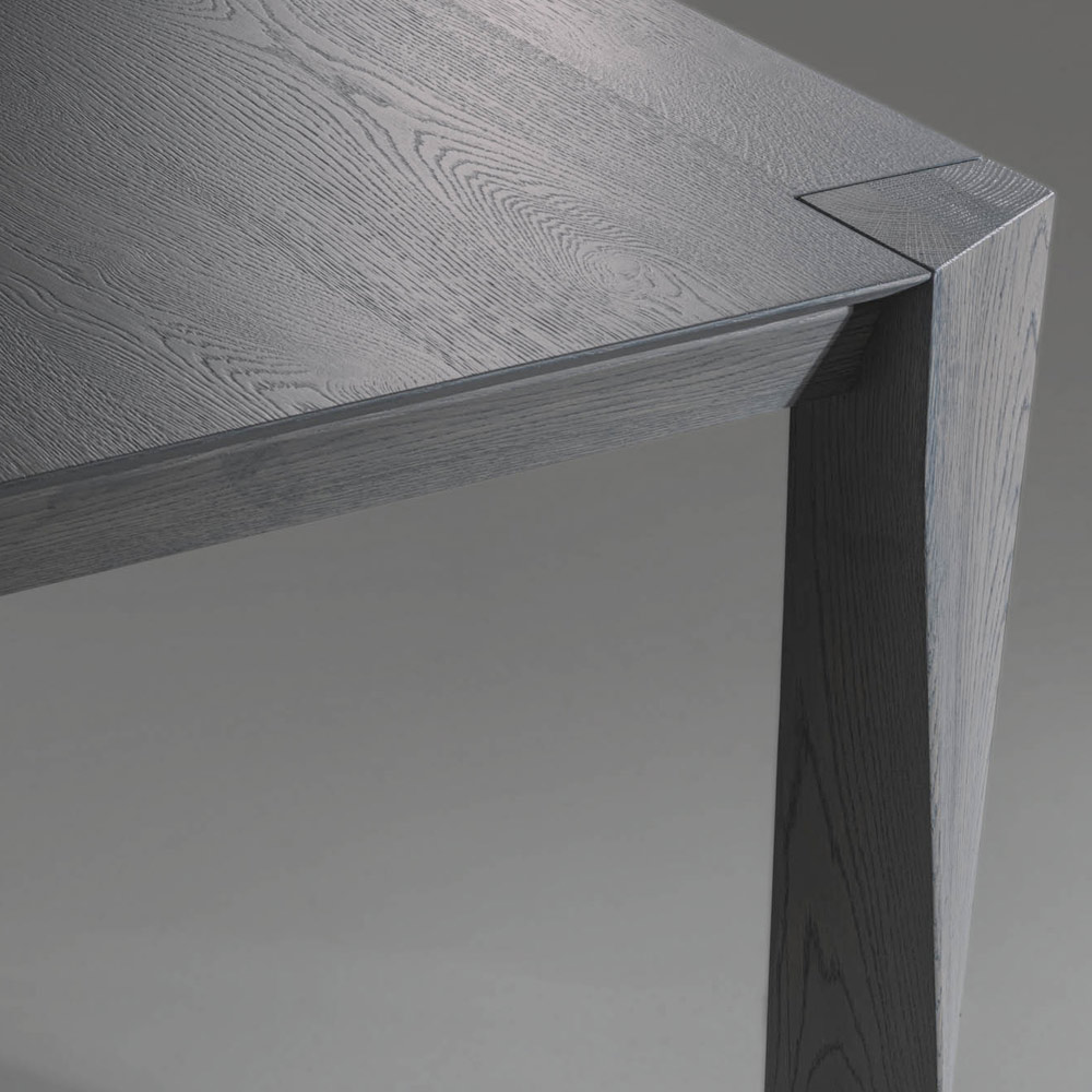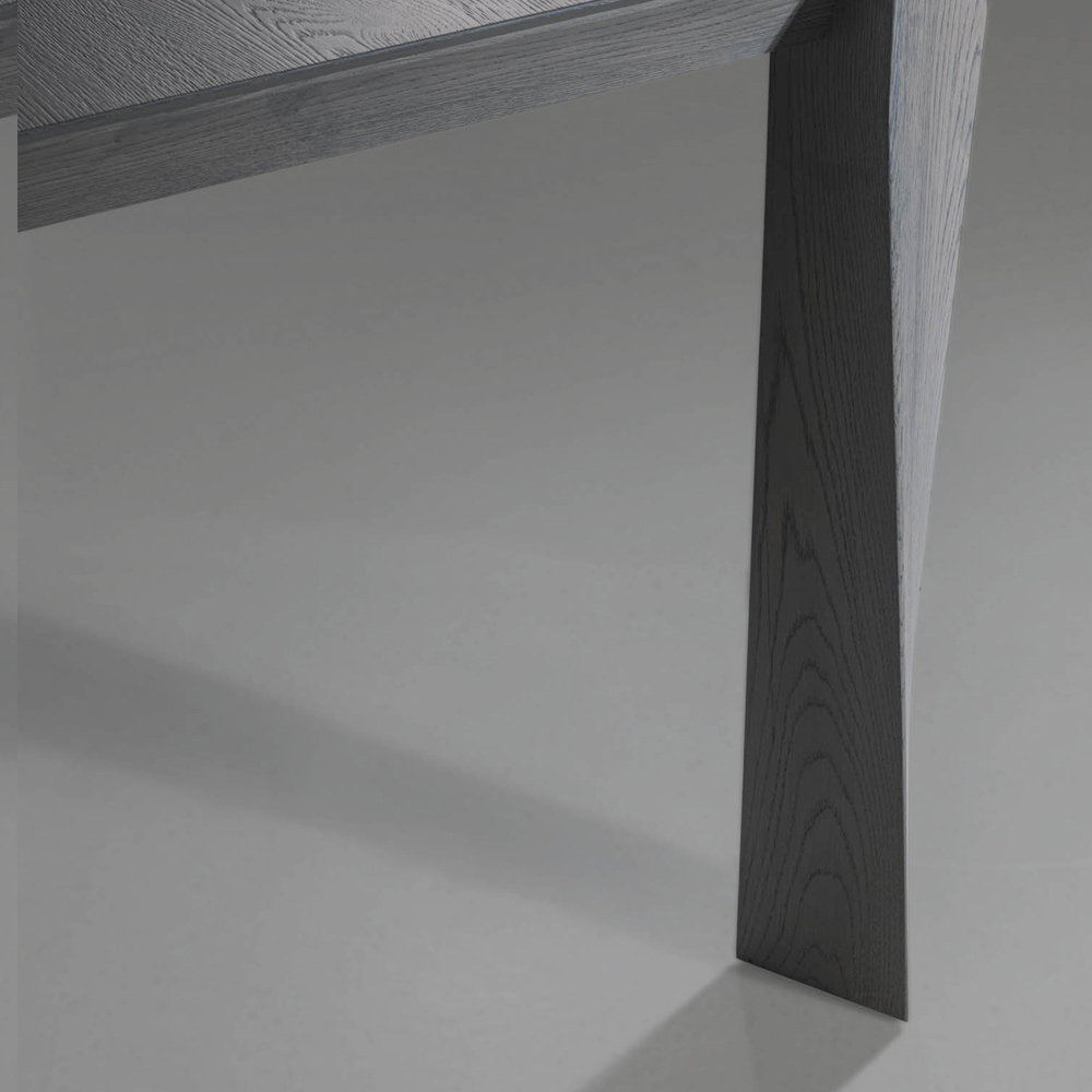 Masa fixa cu blat teșit din furnir de stejar gri și picioare lamelare elicoidale . Dimensiuni H 77 cm, grosime 2 cm.