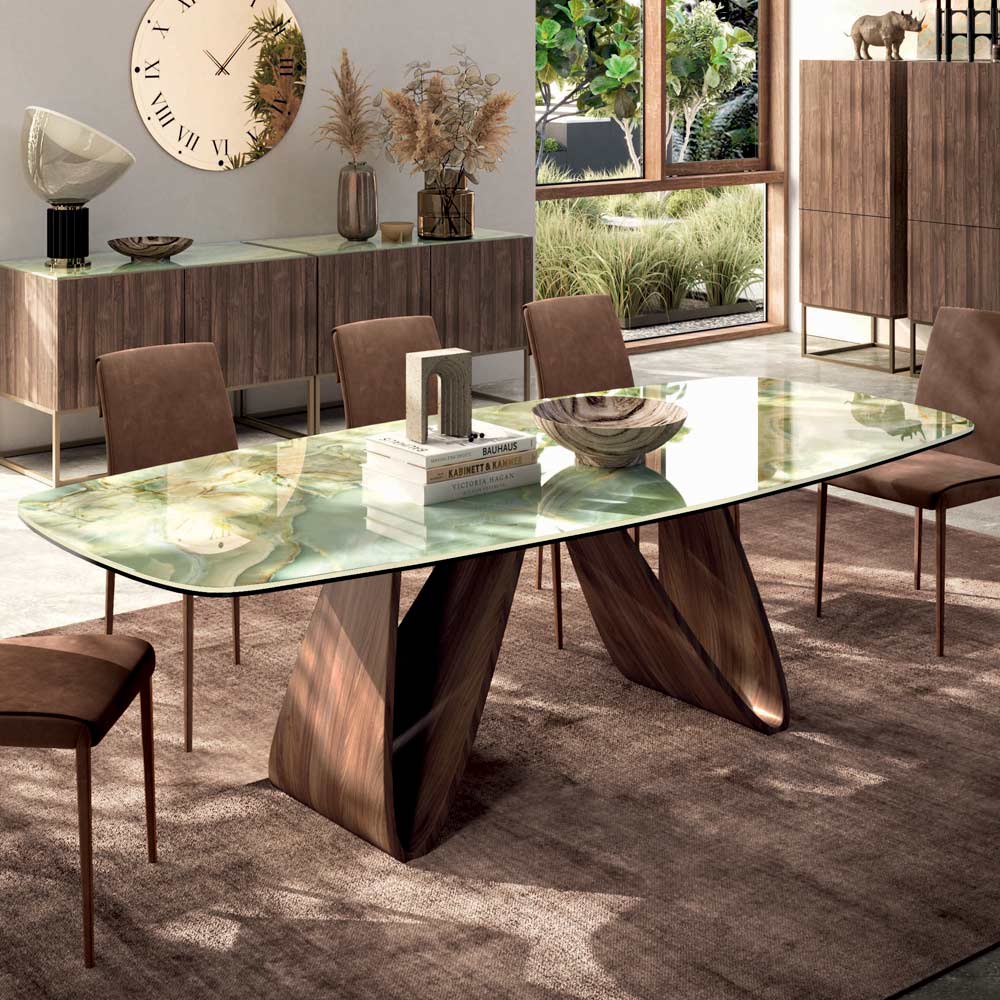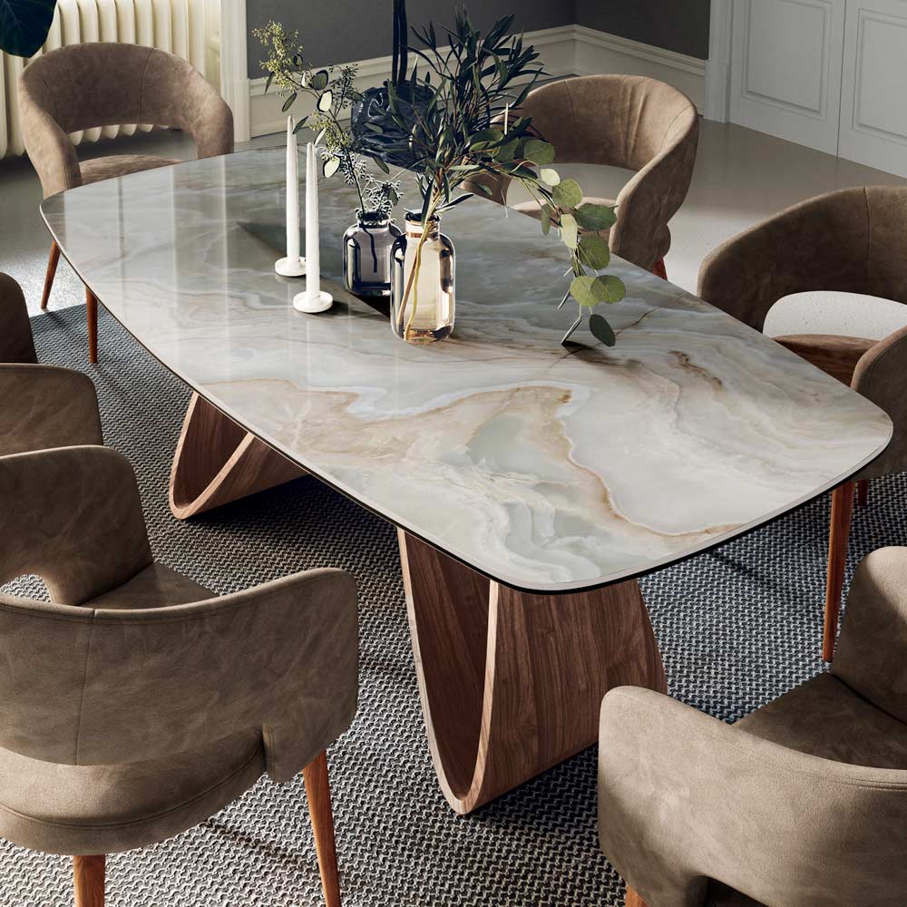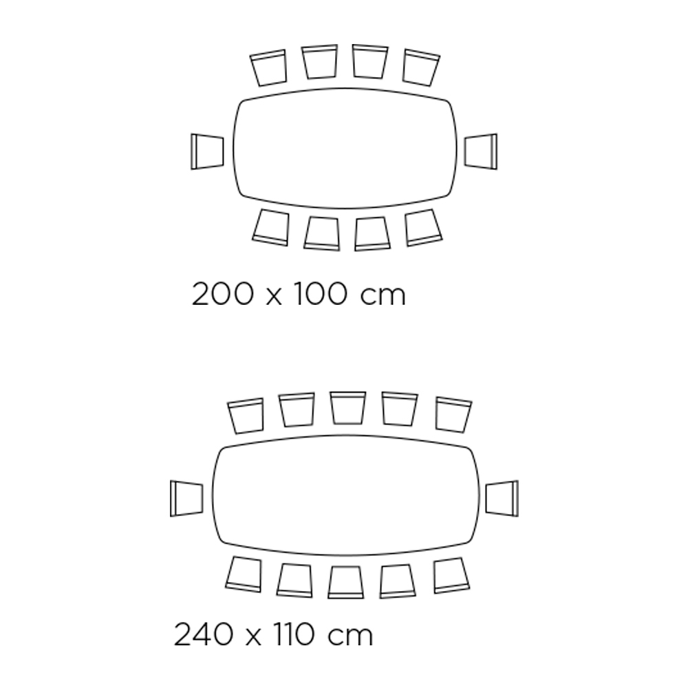 Datorită formei bazei și finisajelor disponibile, masa este capabilă să ofere o