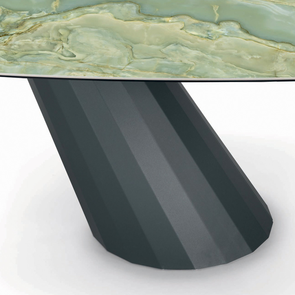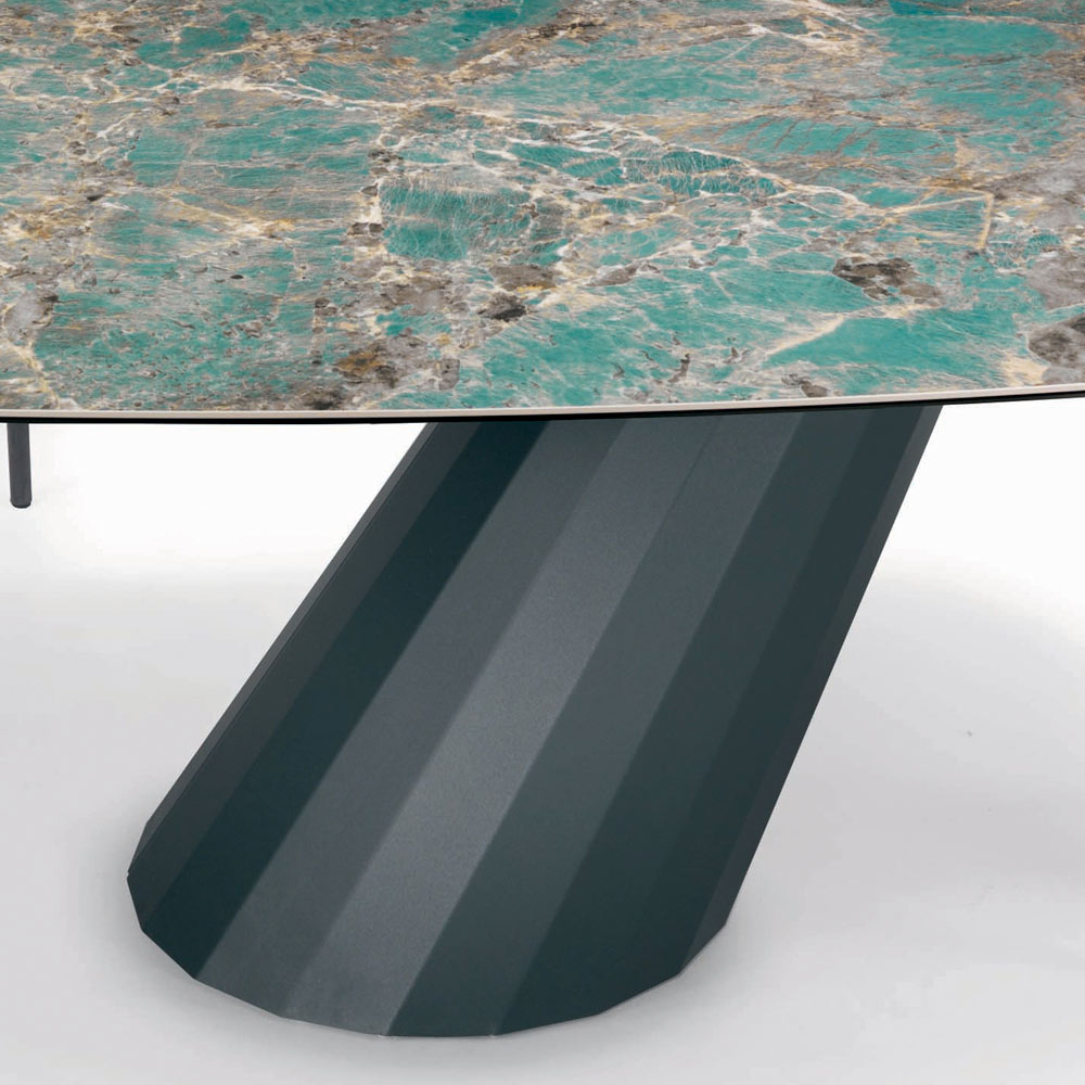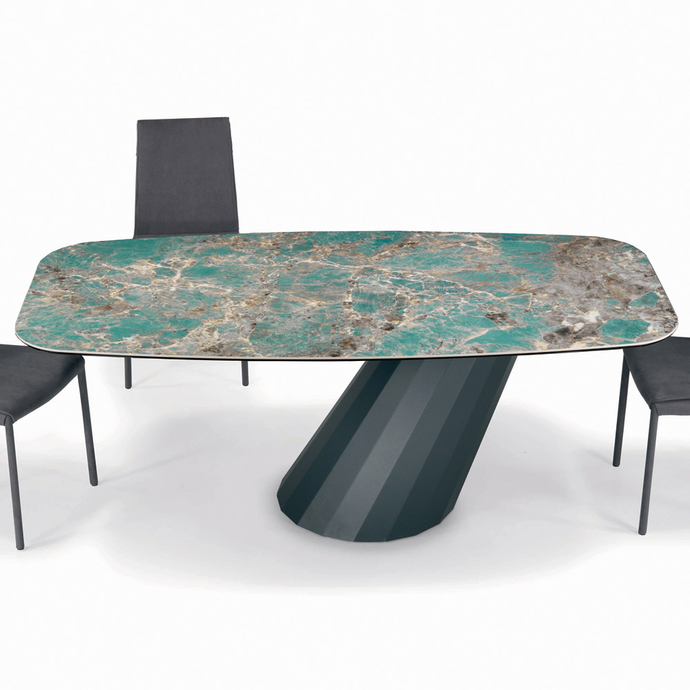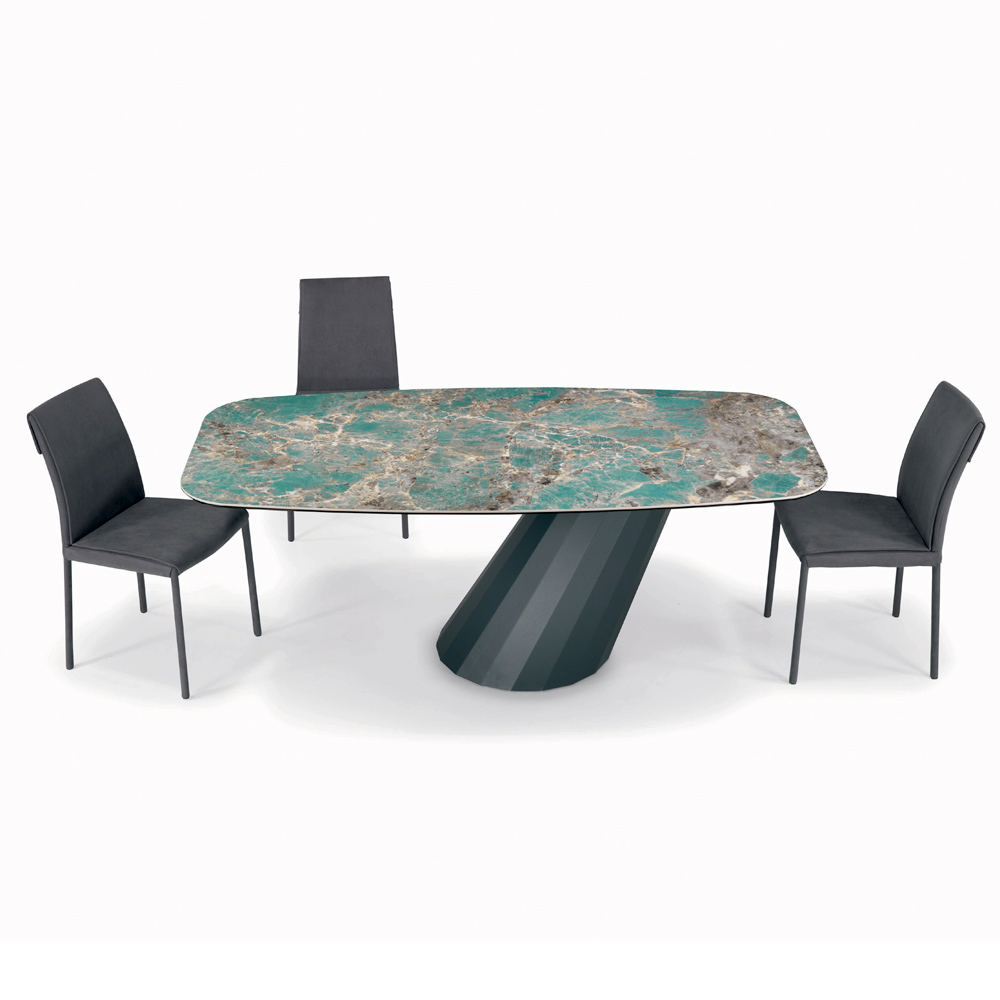 Rafinamentul formei bazei combinat cu finisajul blatului pe care îl alegeți creează o masă unică, cu un mare impact vizual, care amenajează cu