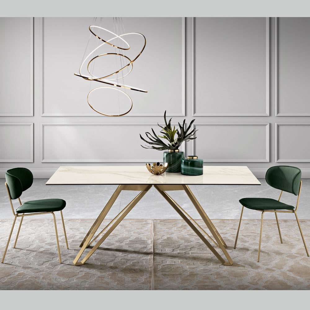 Uimitoare prin contrastul său de materiale și culoare, această masă este o adevărată expresie a luxului și a designului modern. Blatul din vitroceramică cu efect de marmură calacatta cu nuanțe delicate este o sărbătoare a eleganței naturale, rezistent și în același timp extrem de rafinat.