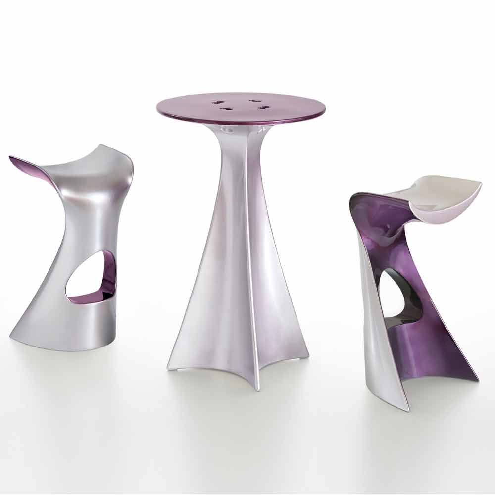 Baza argintie se imbina cu blatul mov. Pentru mobilierul care își lasă amprenta,