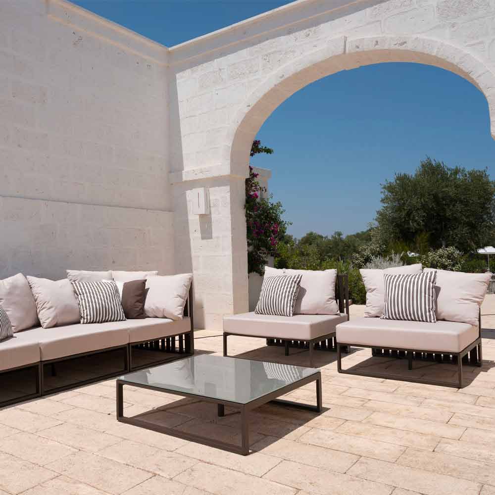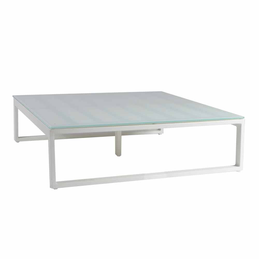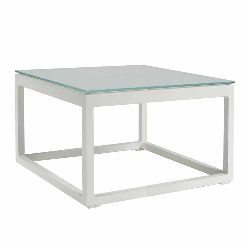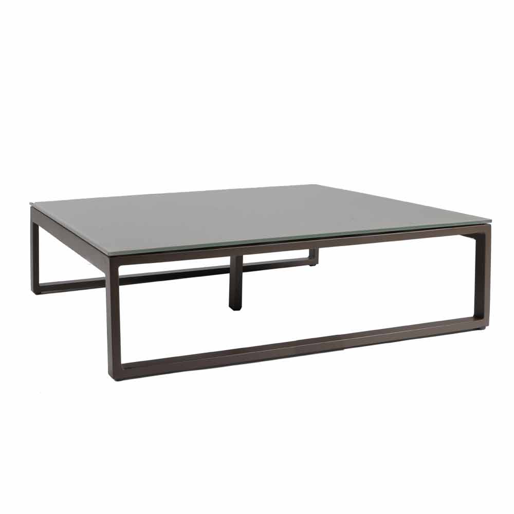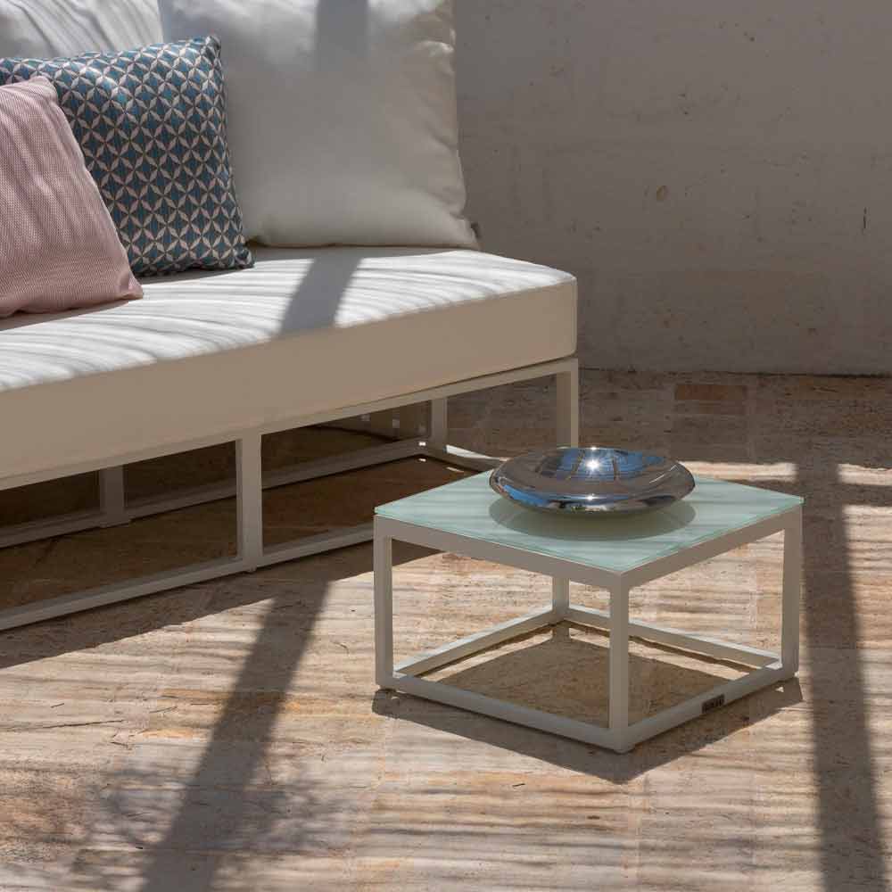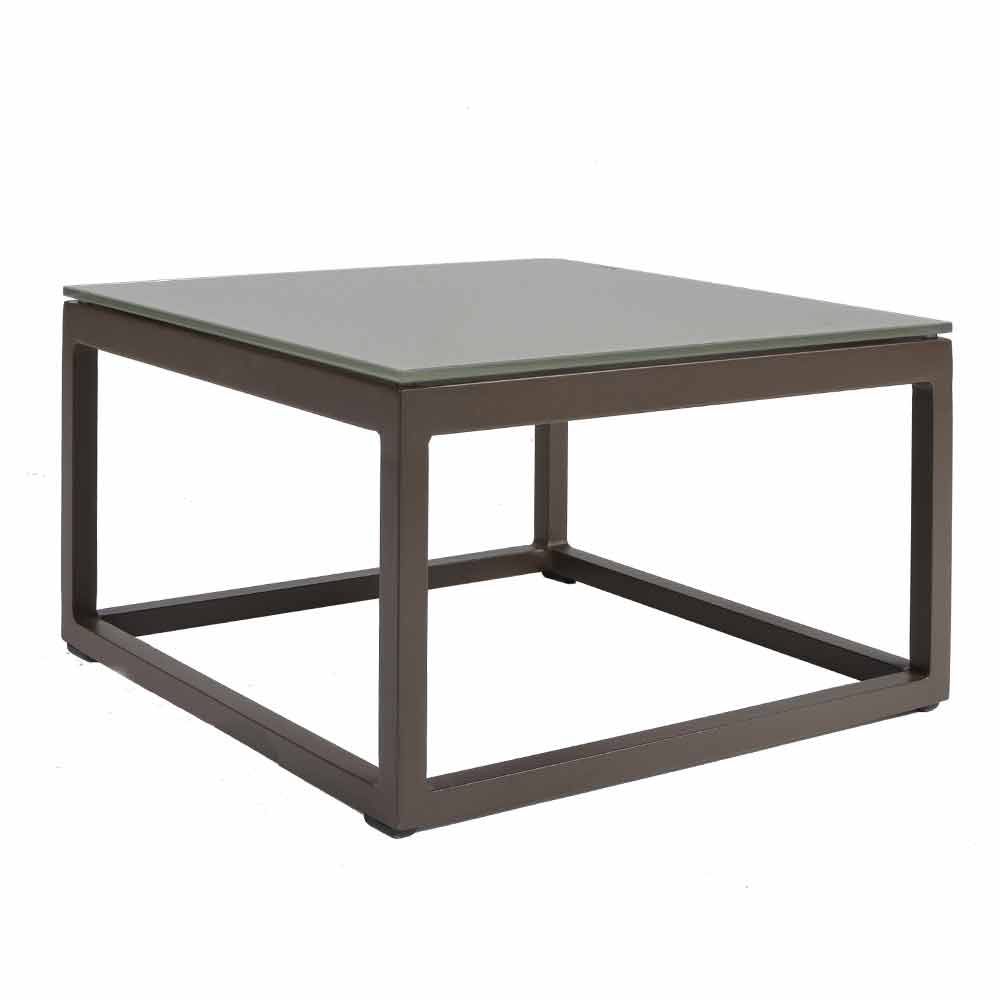 Masă joasă de exterior cu structură din aluminiu în 3 finisaje și blat pătrat din sticlă sau laminam.