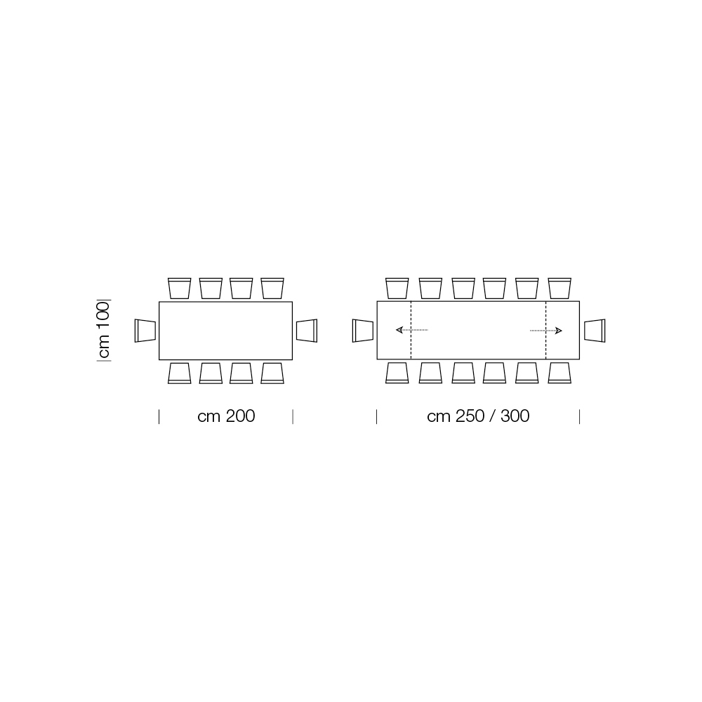 - L 200 (300) x D 100 x H 76,5 cm 14 locuri extensibilă cu două extensii exterioare de 50 cm.
