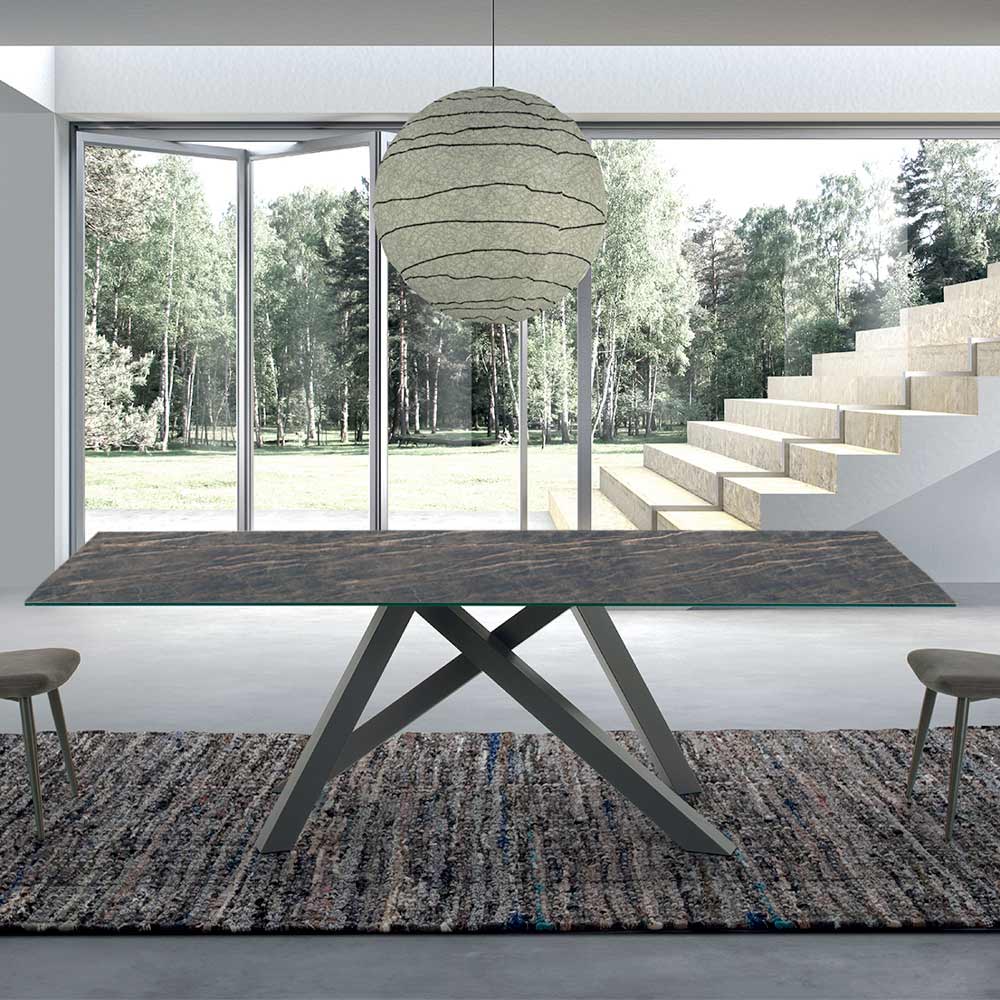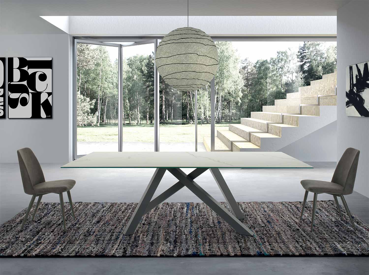 Masa cu blat ceramic si baza din otel gri porumbel de design modern fabricata in Italia.
