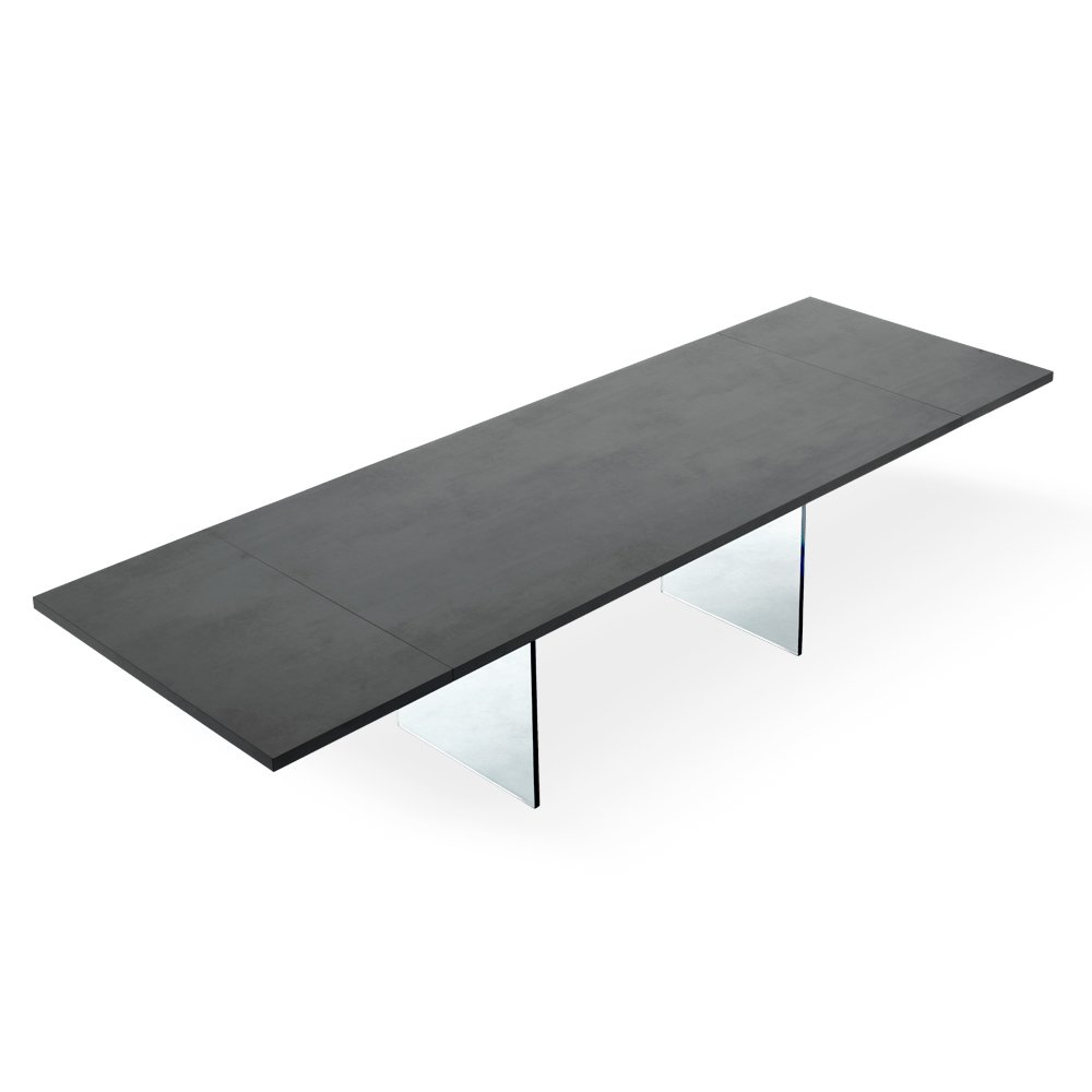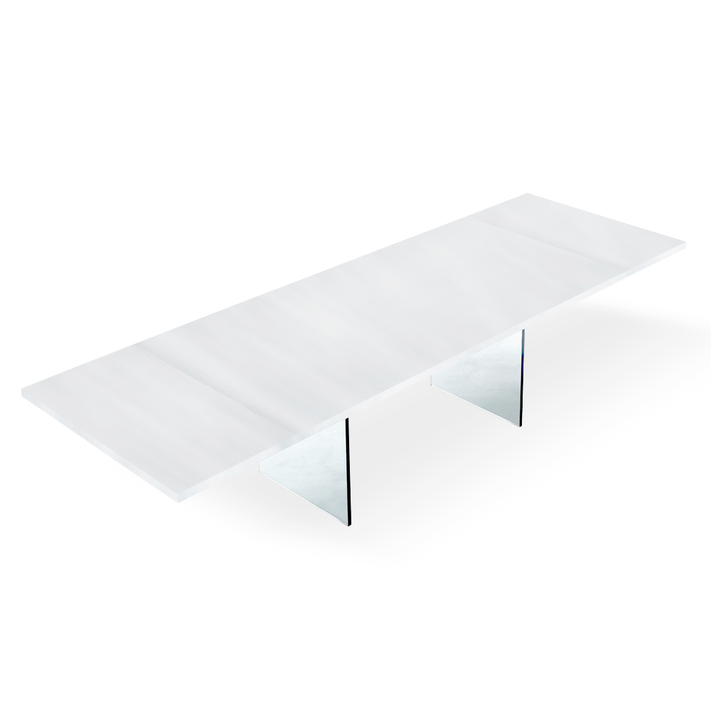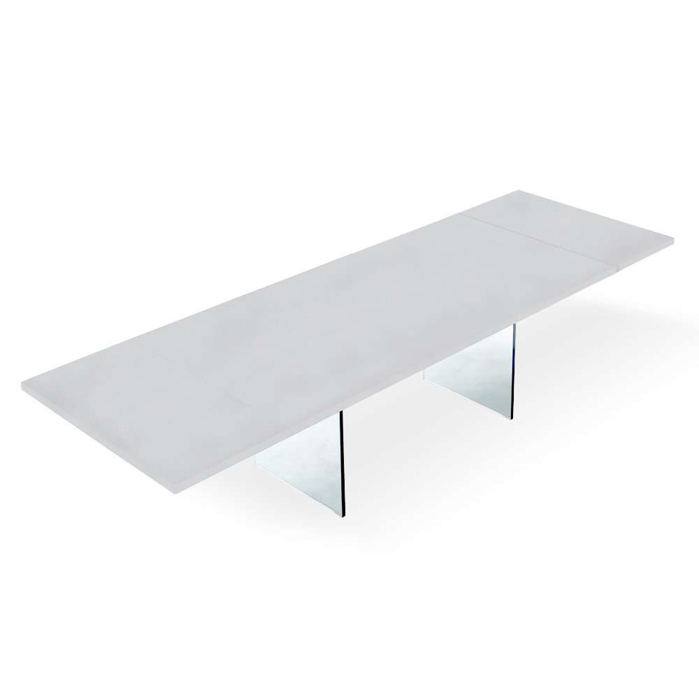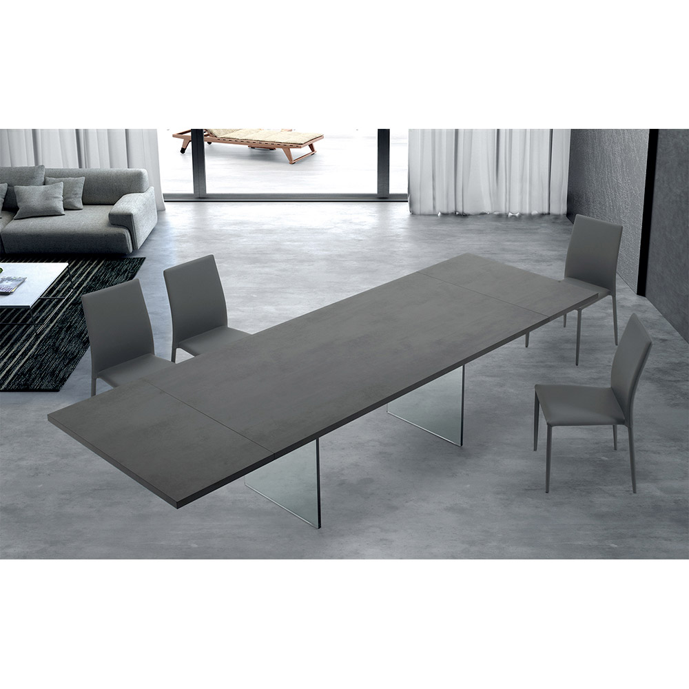 Masa de living extensibila cu blat din lemn laminat si baza din sticla transparenta realizata manual in Italia.