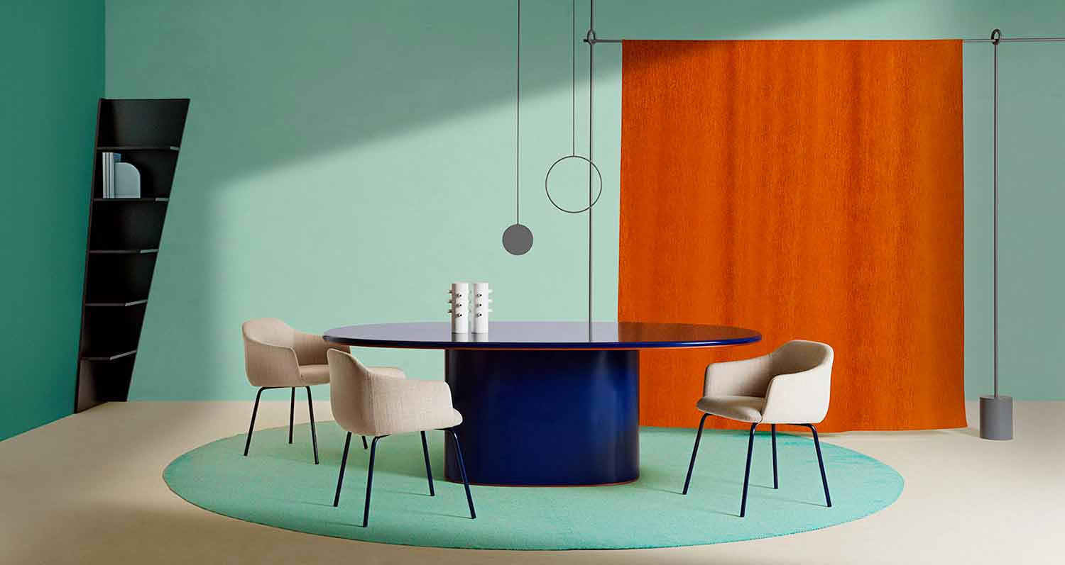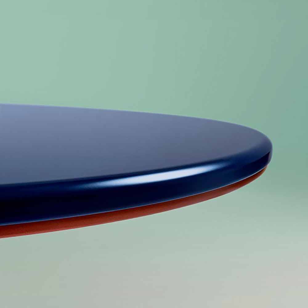 Masa de sufragerie ovala din MDF lacuit albastru cu detalii din cupru cu un design modern si original fabricat in Italia.