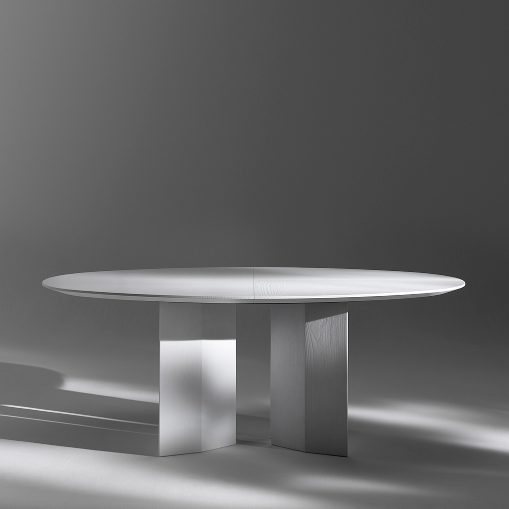 Această masă ovală se remarcă prin designul său sculptural și esențial, unde volumele pline și proporțiile echilibrate creează o piesă de mobilier atrăgătoare din punct de vedere vizual. Blatul oval interacționează cu baza centrală, creând o compoziție solidă și armonioasă, concepută pentru spații contemporane și rafinate.