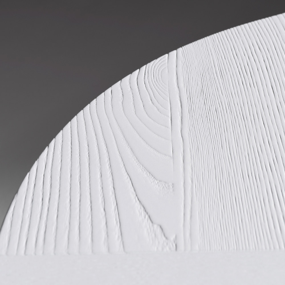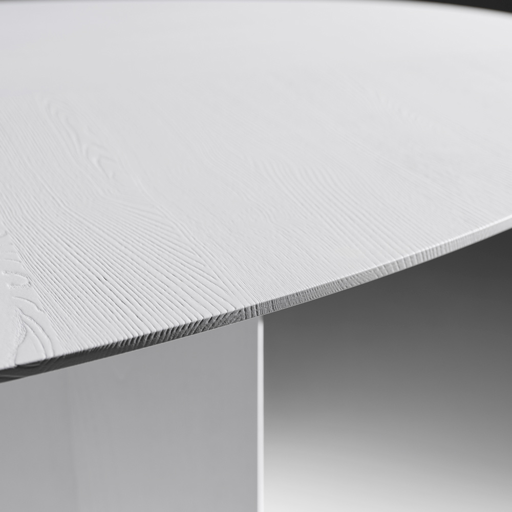 Fabricată din placaj de frasin tratat termic , masa evidențiază fibra naturală a lemnului, amplificând caracterul texturat și profunzimea cromatică. Este disponibilă și în lac negru sau alb , ceea ce o face suficient de versatilă pentru a se adapta la o varietate de stiluri, de la minimal la îndrăzneț și grafic.