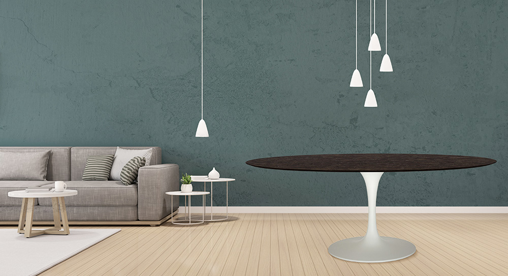 forma ovală și blatul din stejar vopsit mocha conferă acestei mese o