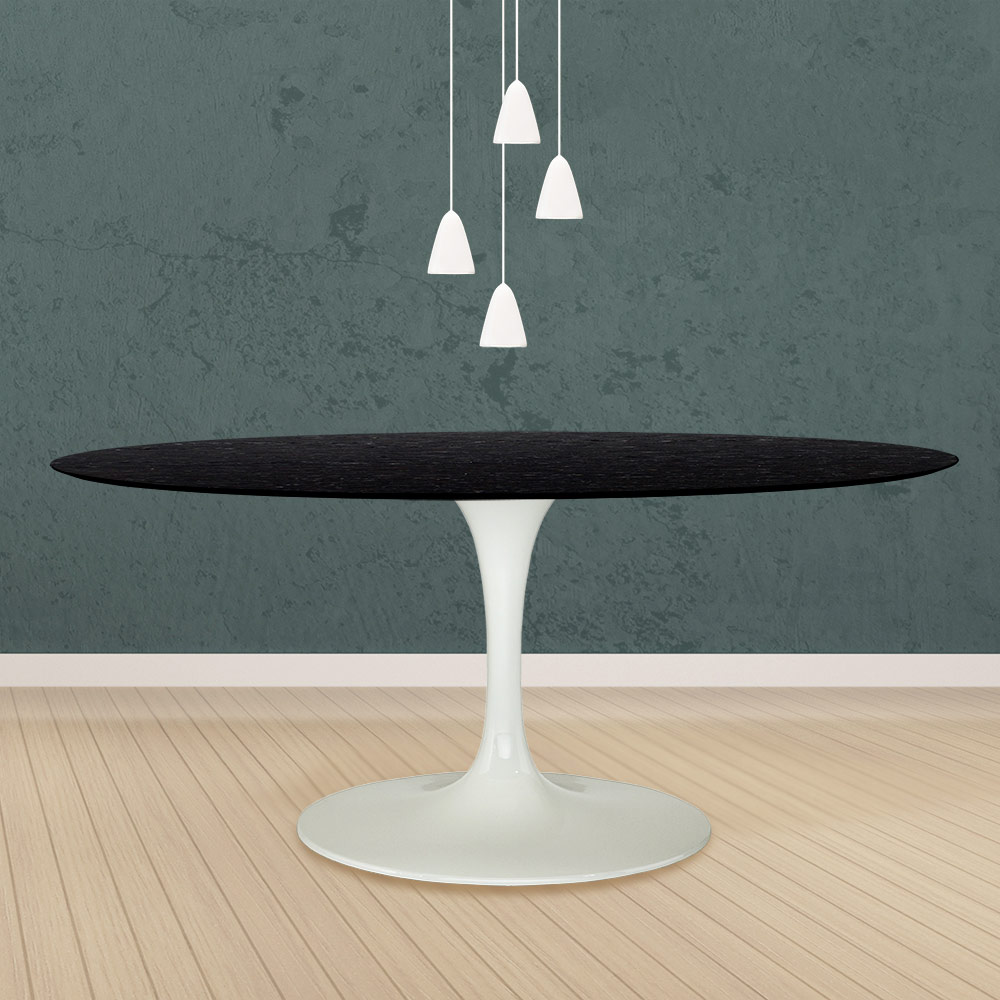 forma ovală și blatul din stejar vopsit negru conferă acestei mese o