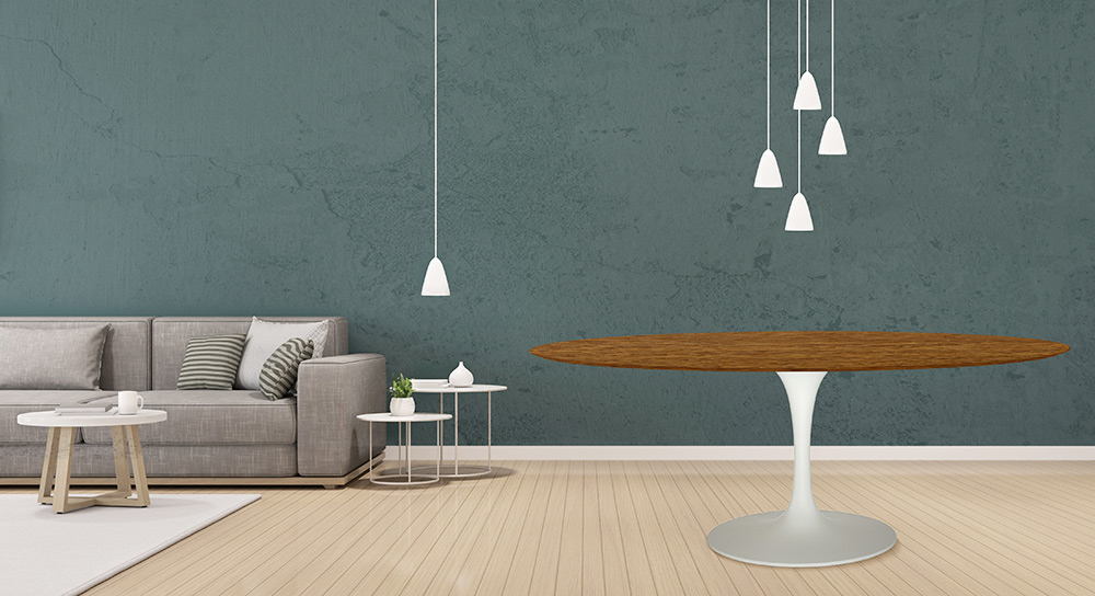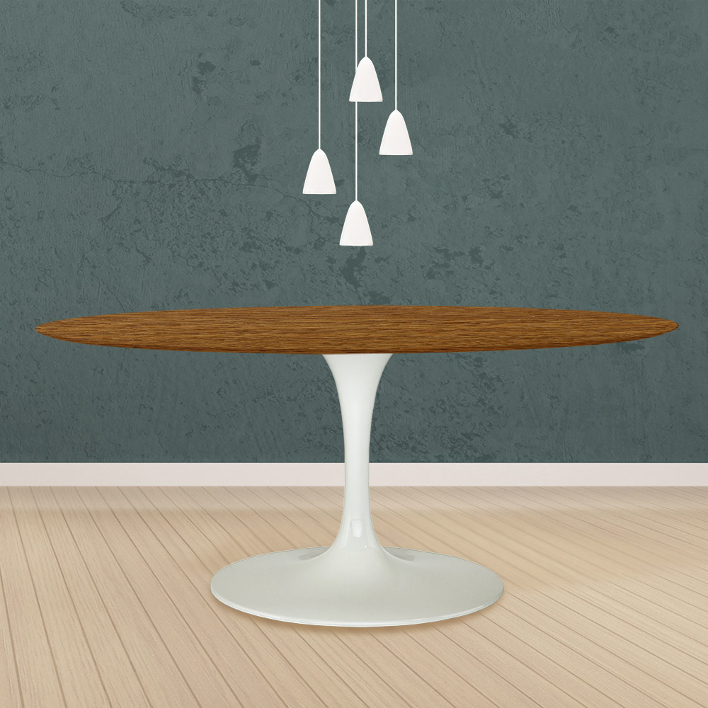 forma ovală și blatul din stejar vopsit nuc deschis conferă acestei mese o