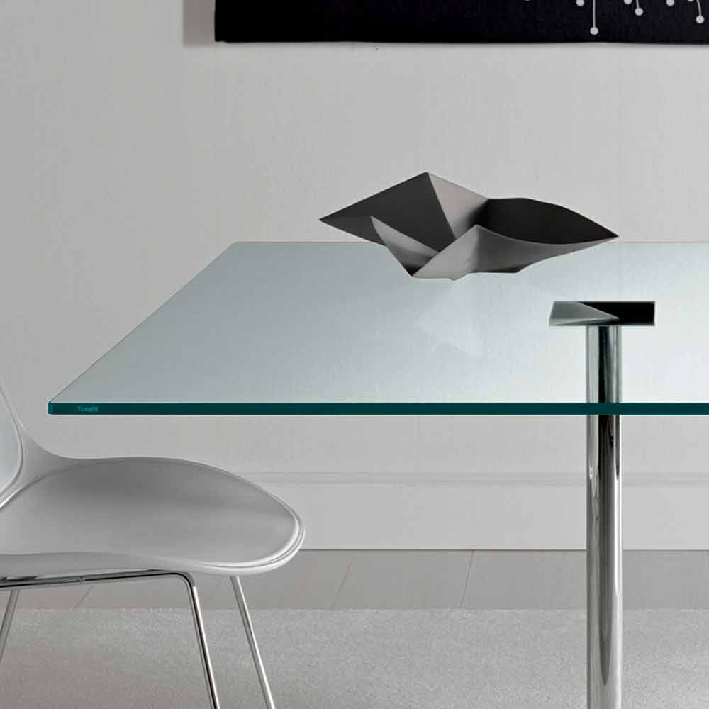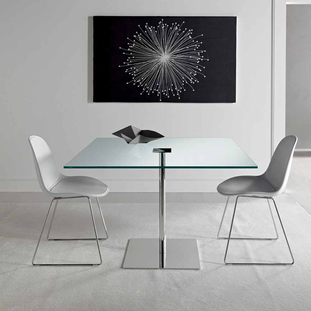 Masă de masă pătrată de lux, cu blat din sticlă extra-limpede și bază metalică cromată, realizată în Italia.