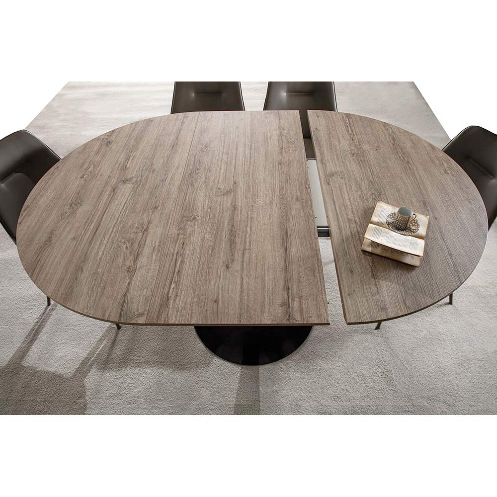 Masa minunata cu blat rotund din lemn stratificat placat (h 30 mm), finisaj stejar texturat cu margine evazata din mdf si baza din otel vopsit negru . Ceea ce face ca aceasta masa sa fie unica si deosebit de functionala este posibilitatea extinderii blatului datorita unei prelungiri exterioare de 50 cm, obtinandu-se astfel o lungime maxima de 170 cm si permitandu-i sa gazduiasca pana la 8 persoane asigurand in acelasi timp o masa mica. care poate optimiza spațiile casei tale odată închis. Eleganța și funcționalitatea sunt cuvintele cheie care descriu cel mai bine această piesă de mobilier modernă care întruchipează un aspect extrem de contemporan capabil să îmbogățească estetica încăperii prin completarea cu sobrietate a mobilierului.